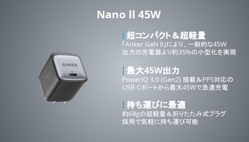 一方のAnker Nano II 30Wは、最大30Wの出力が可能なうえ、USB Power Deliveryにも対応しているため、こちらもスマホからPCまで幅広い機器を急速充電できます。また、Anker Nano llシリーズとしては最小モデルで、一般的な30W出力の充電器に比べて約60%のコンパクト化を実現。本体サイズは約38×32×30mm、重量は約47gとなっています。