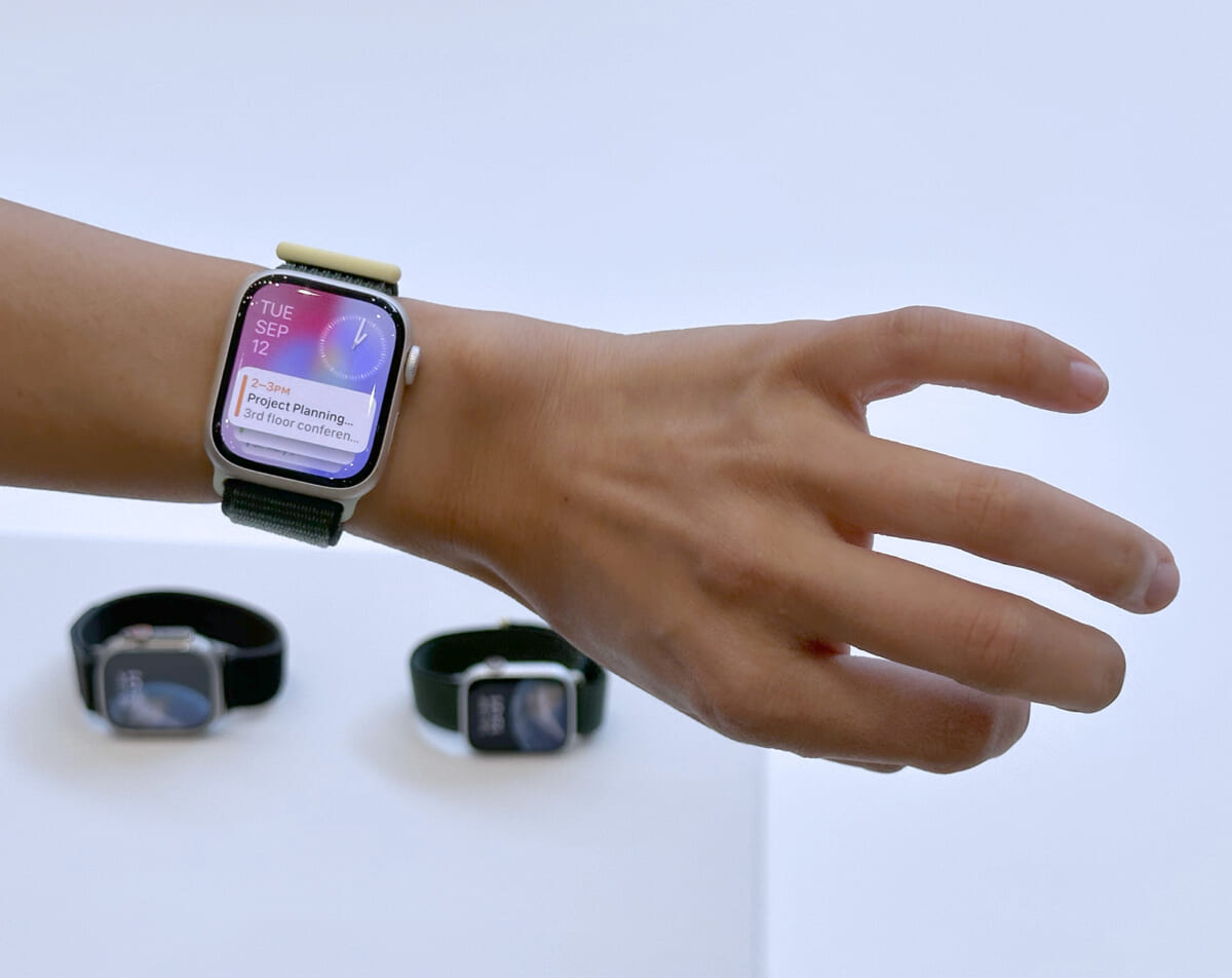Apple Watchを身に着けている手の、親指とひとさし指を2度たたくようなフィンガージェスチャーによって、ユーザーが画面やボタンに触れることなく片手だけで操作できるようになりました。たとえばタイマーの停止、音楽の再生、アラームのスヌーズなどができ、便利な機能です。実機で体験しましたが、指による操作に対する反応が小気味よく正確なので、実際に使う機会が方々で訪れるでしょう。