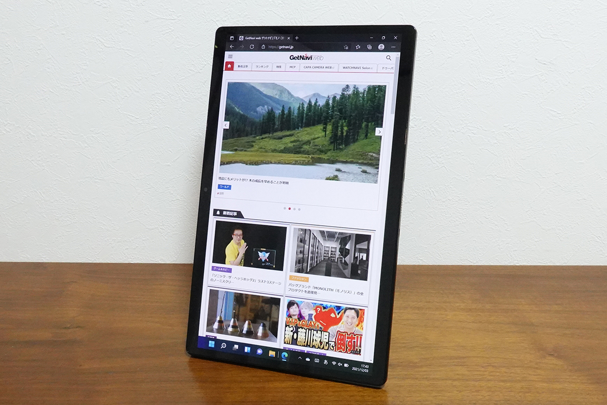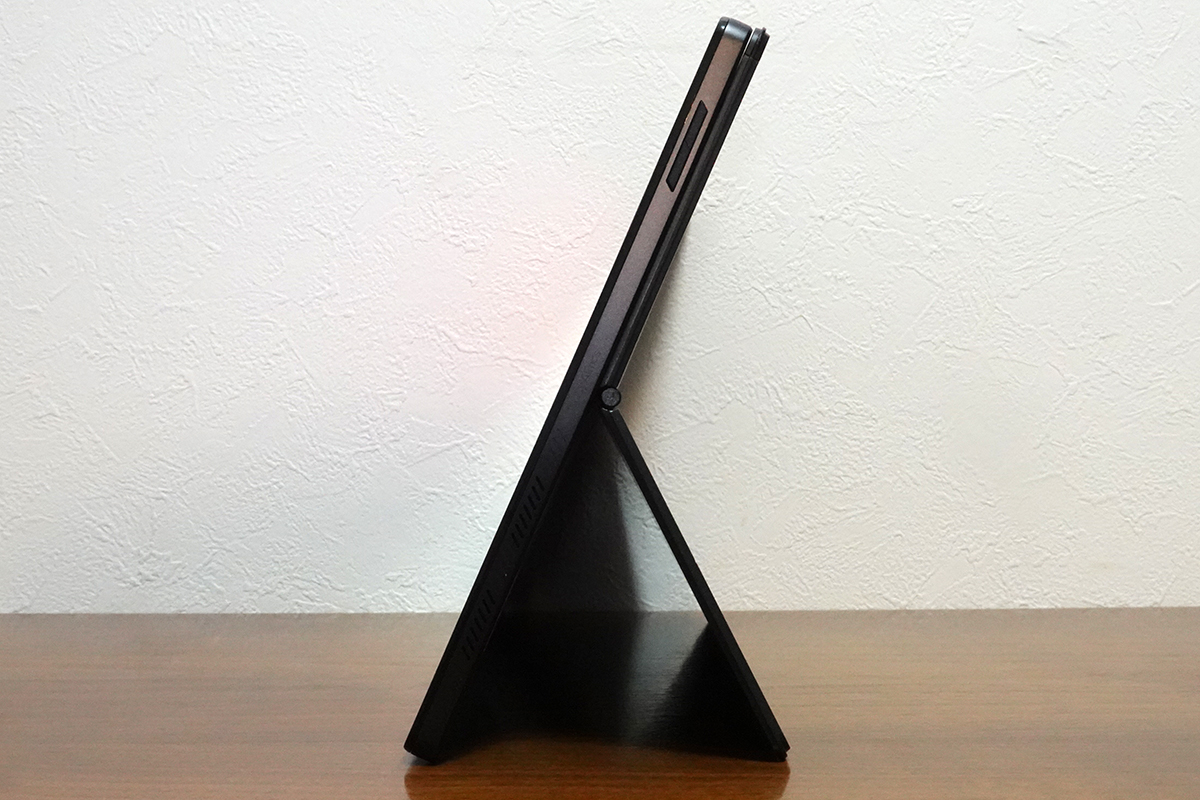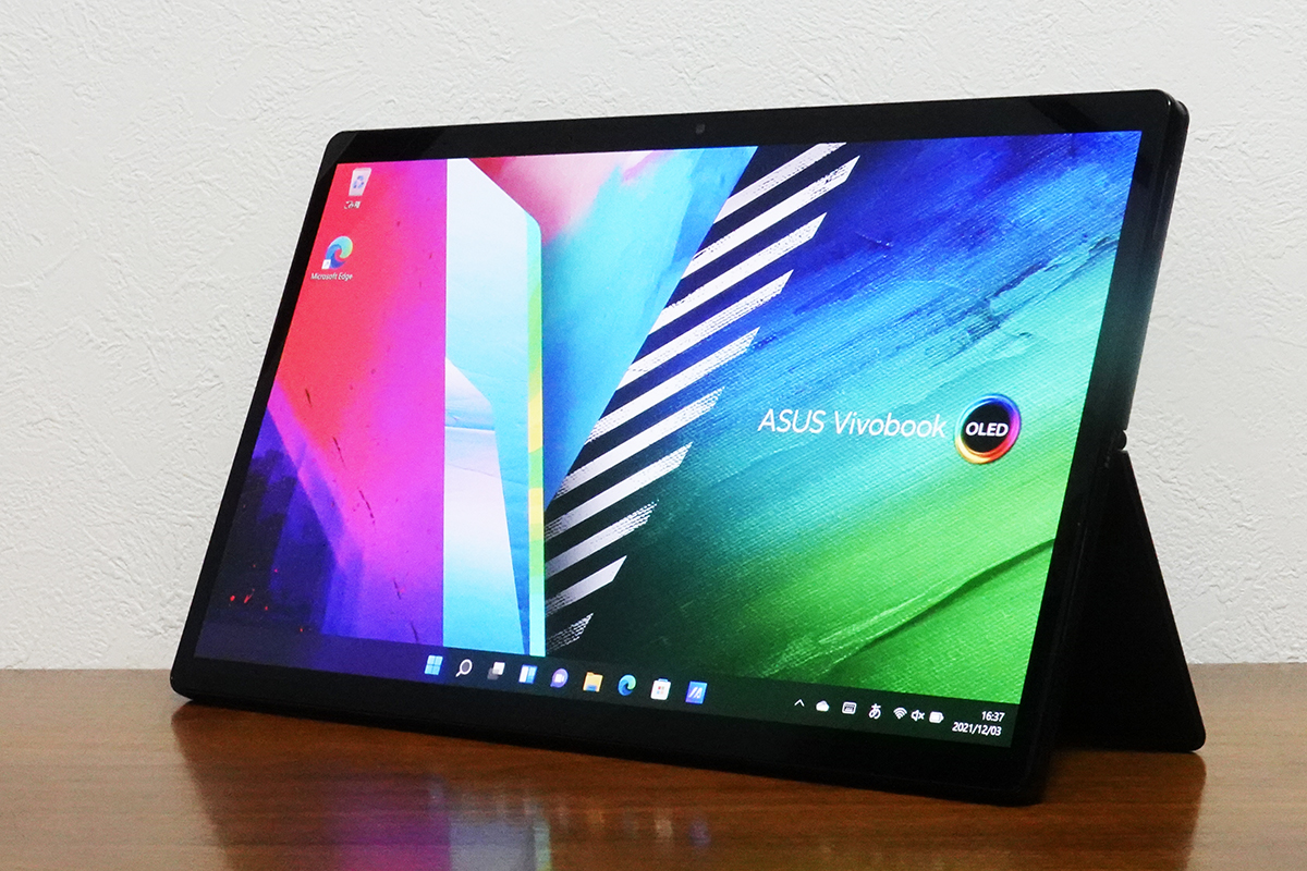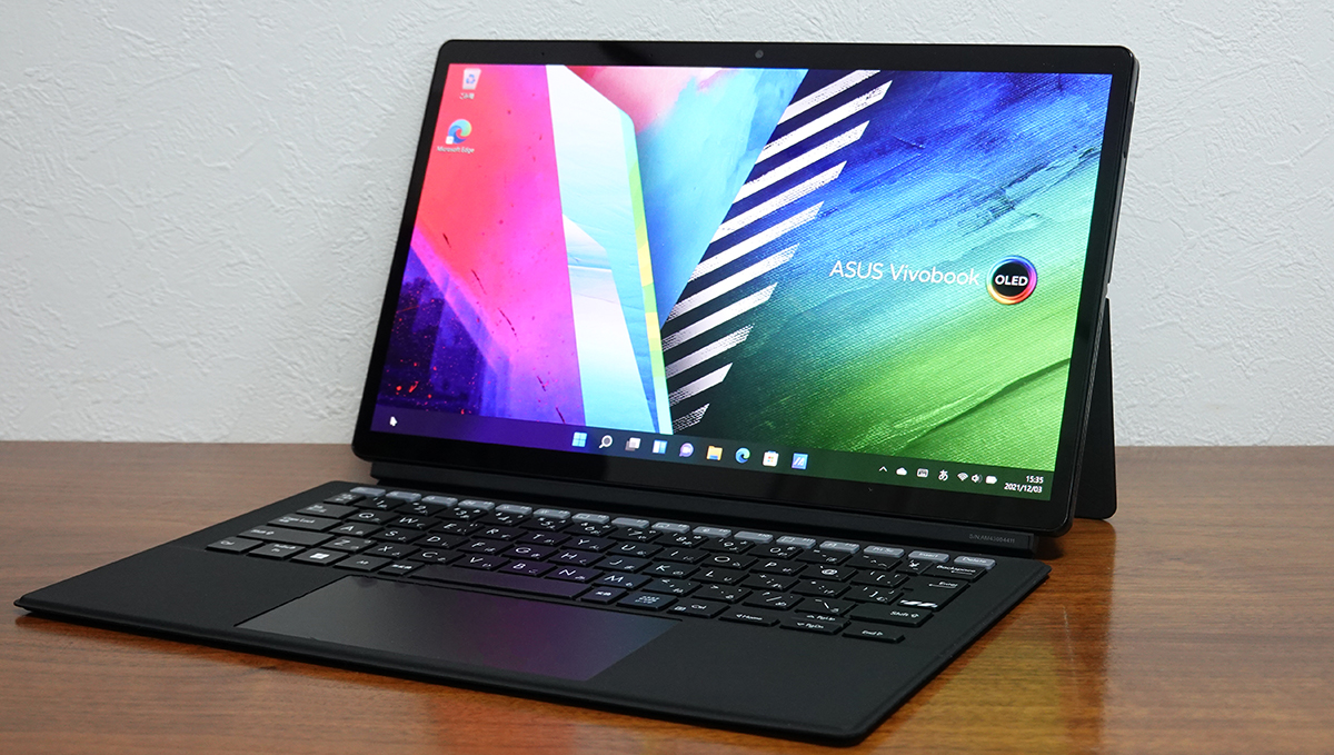 ASUS Vivobook 13 Slate OLEDは、取り外し可能なキーボードが付属したモデル。普段はノートPCとして使え、キーボードを外すとタブレットとして使えます。また、本体背面に取り付けるスタンドカバーも取り外し可能。スタンドカバーは縦横どちらでも設置できるため、動画視聴は横に、SNSなど長いコンテンツを表示する際は縦に設置といった使い方ができます。