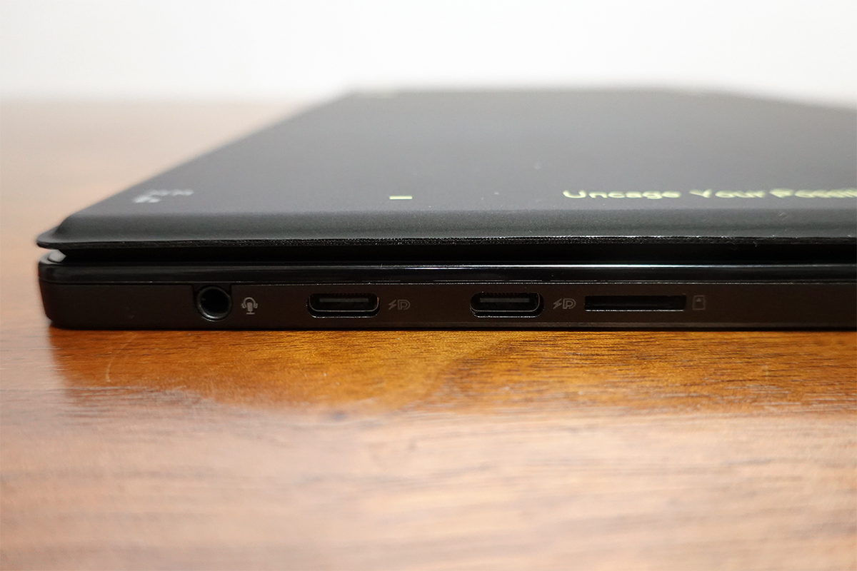 USB Type-C(Thunderbolt 4)、USB 3.2、USB 2.0×2、HDMI出力、microSDカードリーダー、マイク/ヘッドホンジャック