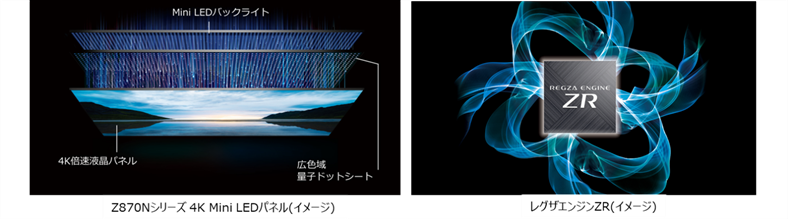 また、4K Mini LED液晶レグザ「Z970Nシリーズ」は、同社従来比1.3倍の輝度を実現した新開発4K Mini LED広色域量子ドット液晶パネルモジュールを搭載。個々のエリアごとのMini LEDの点灯時間だけでなく、電流を高精度で制御する「Mini LED高コントラストテクノロジー」に対応し、輝く光と引き締まった黒が、高コントラストを実現するといいます。