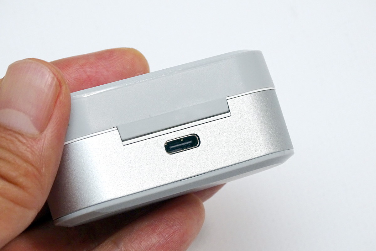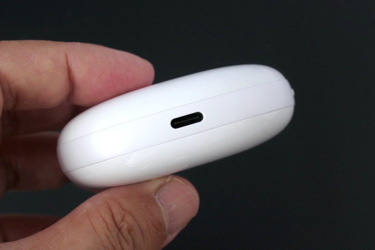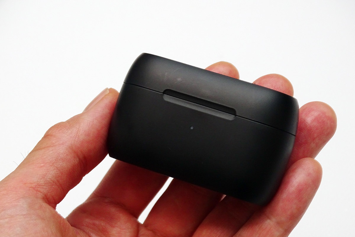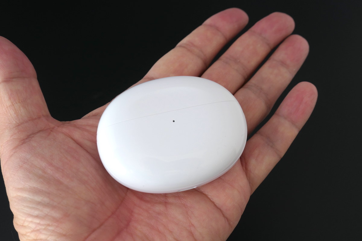 Studio Budsの実機をチェックしていきましょう。充電ケースは表面がさらっとしたマット仕上げで、楕円形のデザインにより手の中に心地よく収まります。イヤホンはケースのフタを開いて横向きに収納します。尖った形状の側面をつまんでケースから出し入れするのですが、ハウジングの表面も指触りがさらっとしているので、着脱時に落とさないよう気を付けましょう。