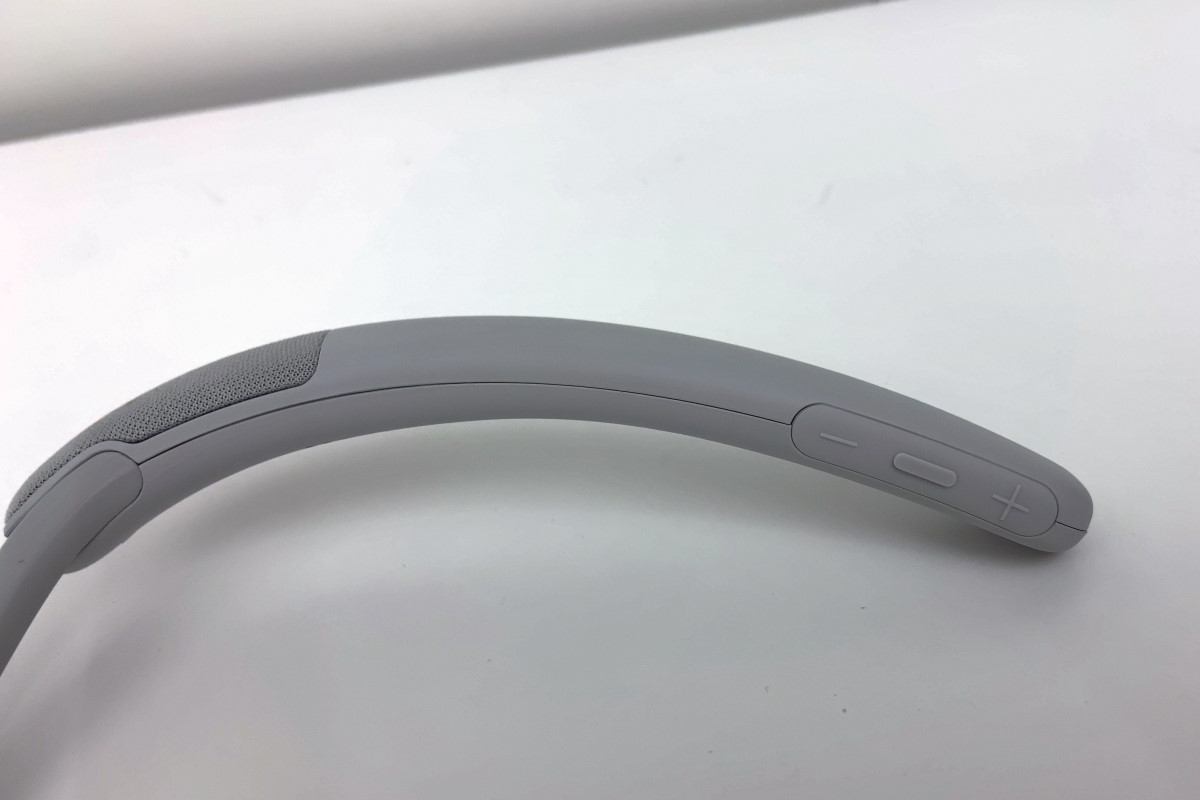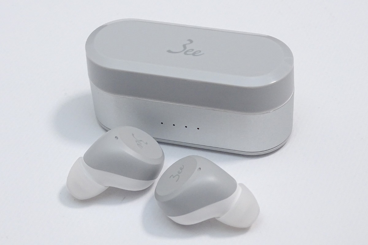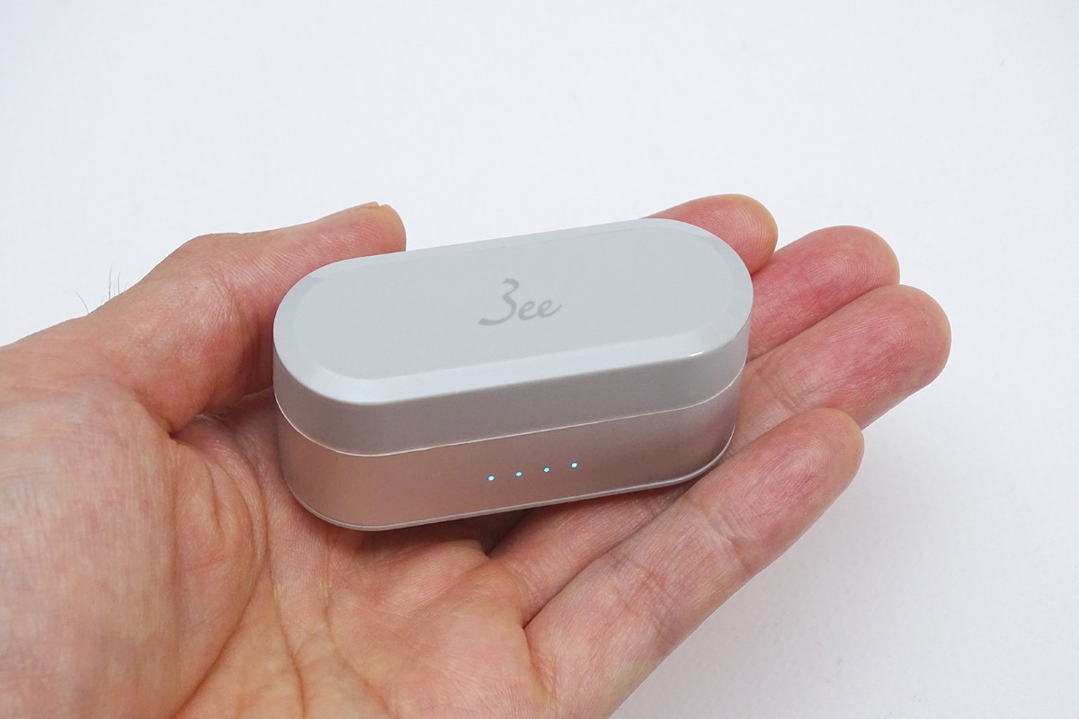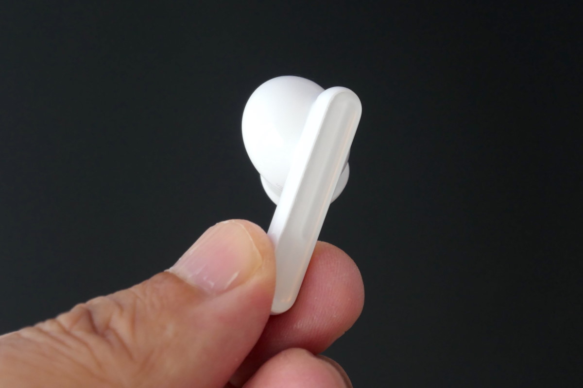 Studio Budsの実機をチェックしていきましょう。充電ケースは表面がさらっとしたマット仕上げで、楕円形のデザインにより手の中に心地よく収まります。イヤホンはケースのフタを開いて横向きに収納します。尖った形状の側面をつまんでケースから出し入れするのですが、ハウジングの表面も指触りがさらっとしているので、着脱時に落とさないよう気を付けましょう。