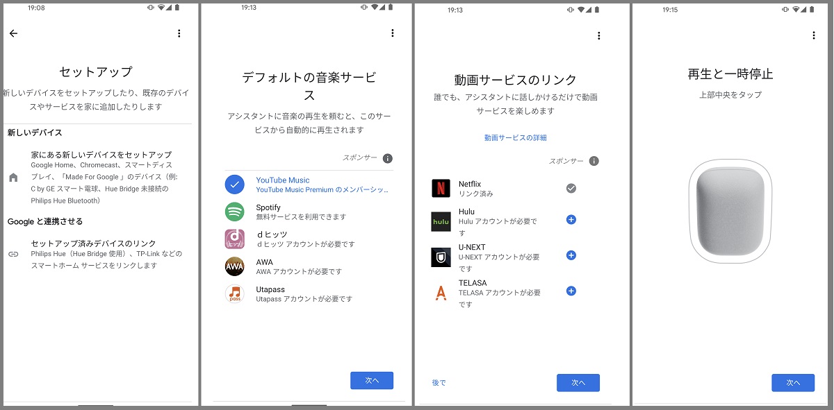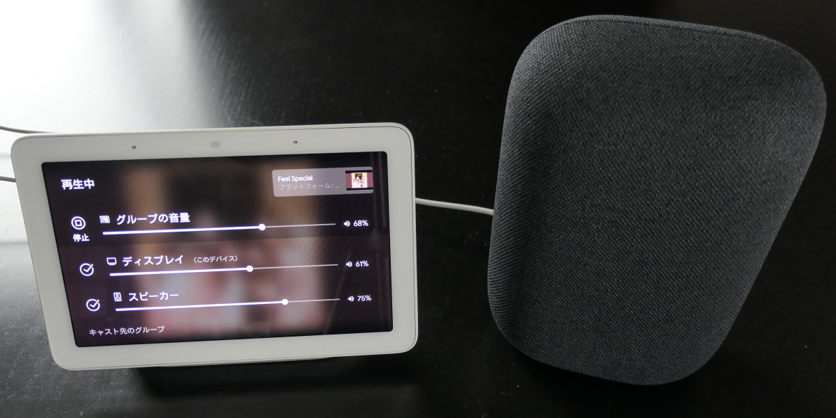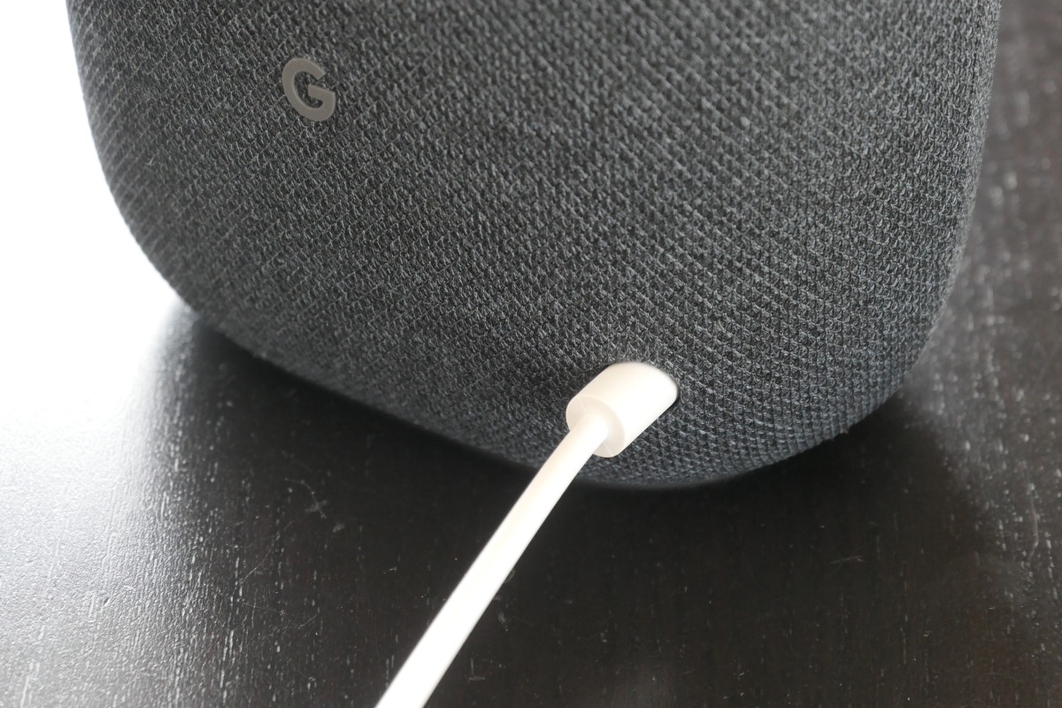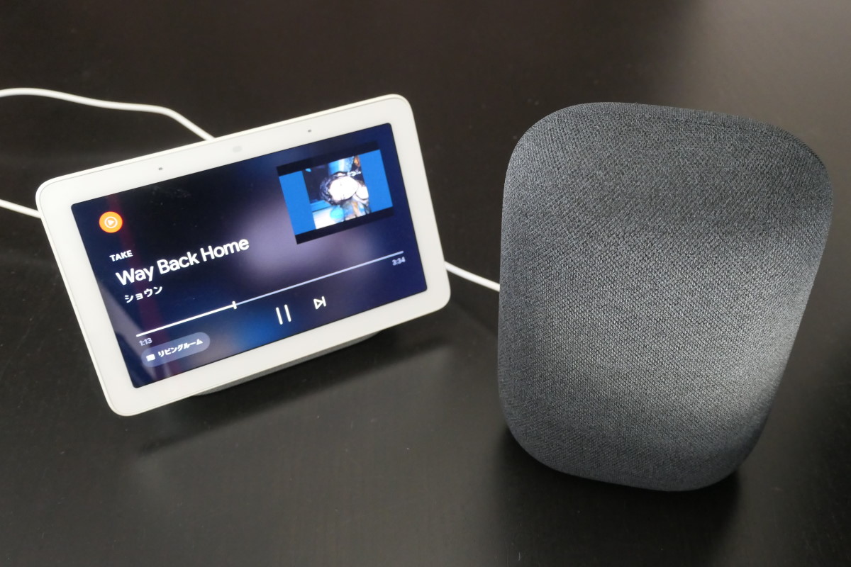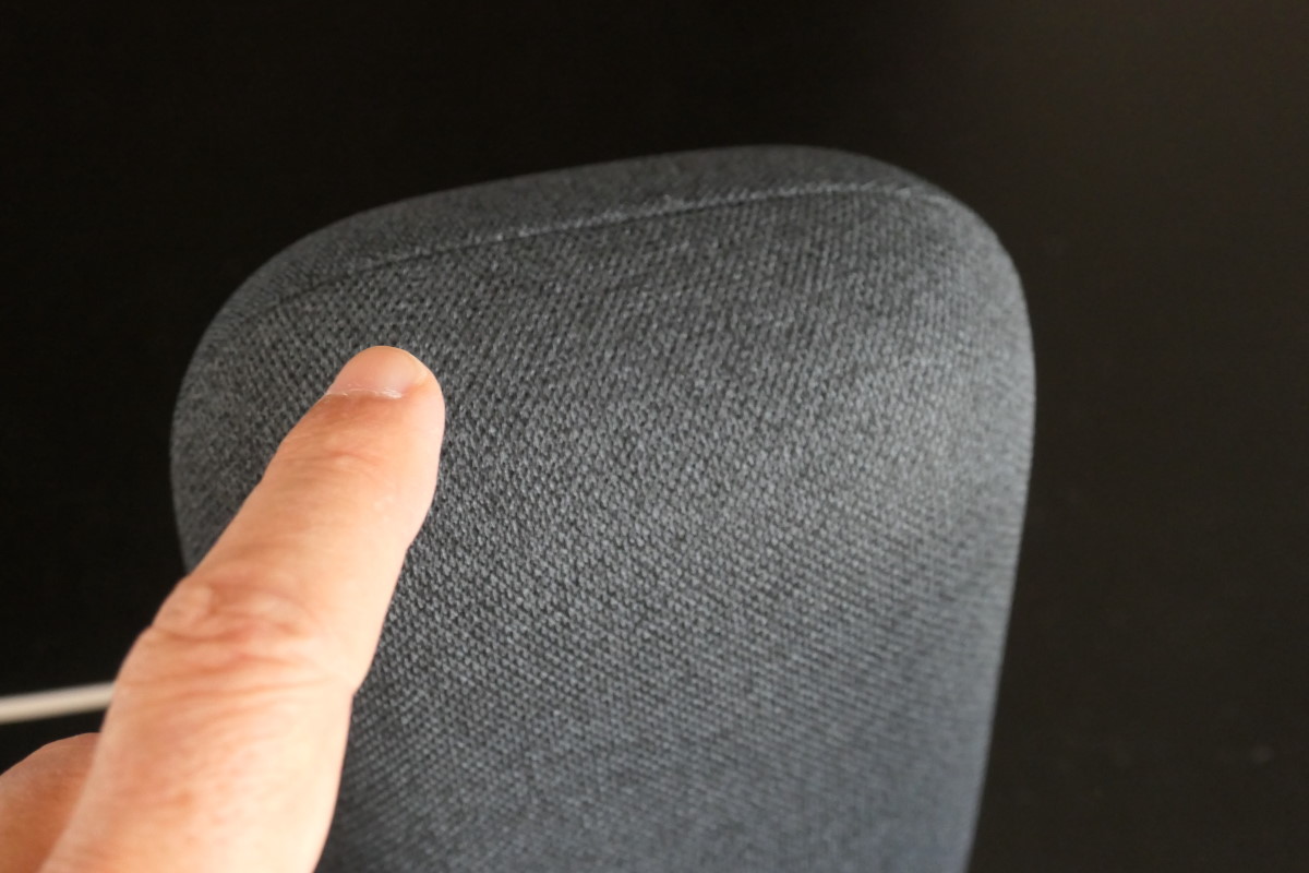 本体前面の上部にタッチセンサーが搭載されていて、中央をタッチすると再生・一時停止、右をタッチすると音量を上げて、左をタッチすると音量を下げられます。もちろん「OK Google 音楽を止めて」「音量を下げて」などと声で操作できますが、スピーカーの近くにいる場合は、タッチで素早く操作可能。これは、従来のGoogle Homeと同じです。