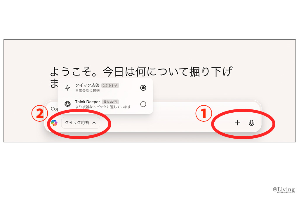 「通常は『クイック応答』(上記画像②)になっていますが、複雑な質問をしたいときは『Think Deeper』に変更するとより精度の高い回答が返ってきます。私は事業のアイデアや企画出しの壁打ちをしたいときにThink Deeperモードをよく使います。ただし、Think Deeperモードは30秒掛けてゆっくり思考するため、通常はクイック応答にしておいて、必要なときだけ使うといいでしょう」