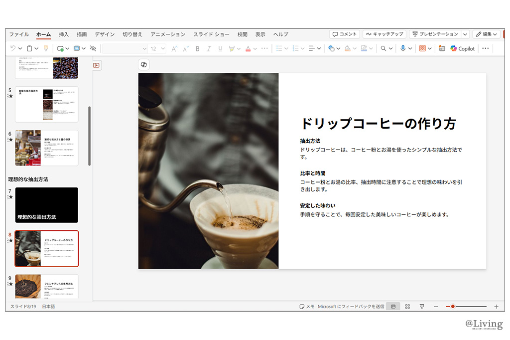 「PowerPointでは、プレゼン用のスライドのたたき台を作るときに使うのが便利です。Copilotに、簡単なテーマを入れるだけで内容を提案してくれます。このとき、生成AIで作られた画像が使われるので、自分で画像を探す手間も省けます」