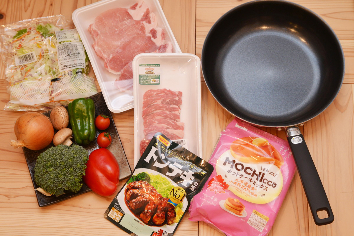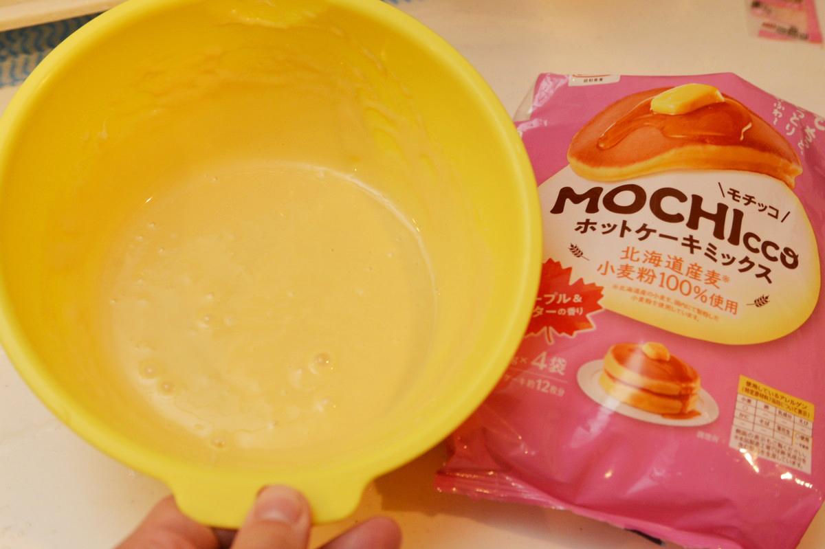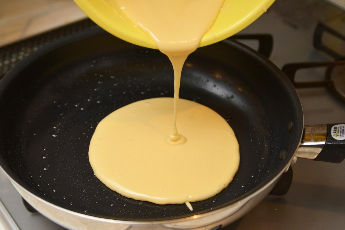 最後は、フライパンのコーティング性能の違いがわかる粉もののなかから、ホットケーキにトライしました。手軽に作れる市販のホットケーキミックスを使い、生地を焼いていきます。
