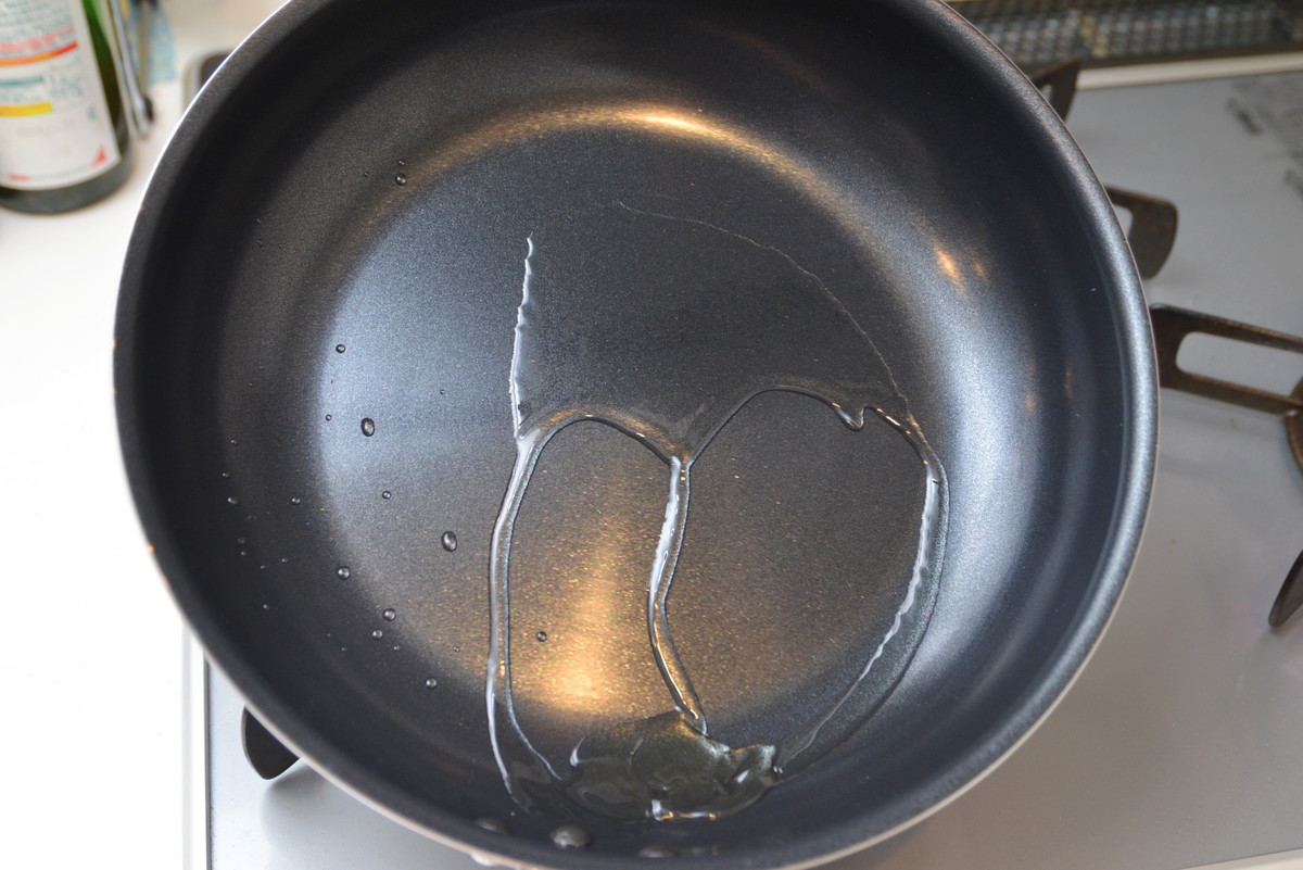 まずはフライパンに油をひいて加熱したところ、油のすべりが秀逸で、よくなじみます。「evercook Pro」の公式サイトには「シルクのようななめらかさ」という表現がありますが、まさにその通りの使い心地です。