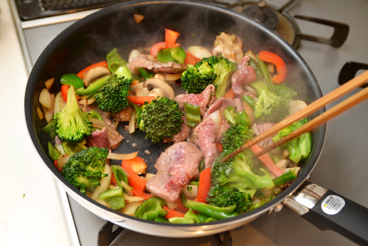 ここからは実際に調理してみて、その使用感をレポートしていきます。まずはフライパンの基本性能の確認から。肉や野菜をうまく加熱できるのか? ということで、「牛肉と野菜炒め」を作ります。
