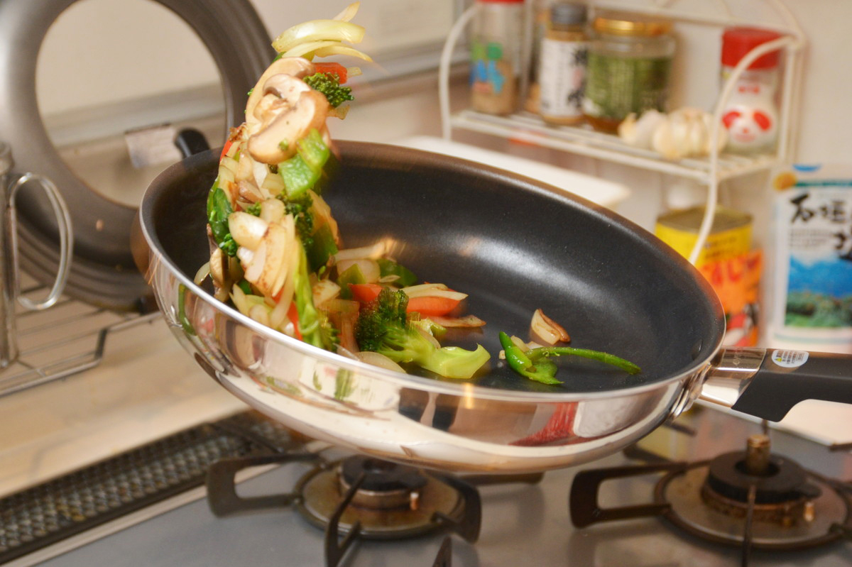 続いて肉と野菜を投入して炒めてみたところ、通常のステンレスパンと違って熱回りが早い! 野菜からの水分が素早く蒸発してベチャッとならず、肉にもスピーディに火が通ります。