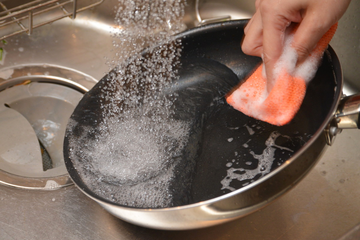 煮詰まったタレがフライパンにベットリとこびり付いているだろうな……と思ったら、フライパンを傾けるとタレがスルンと流れていきます。表面のコーティングのおかげで、焦げ付きはまったくありません!