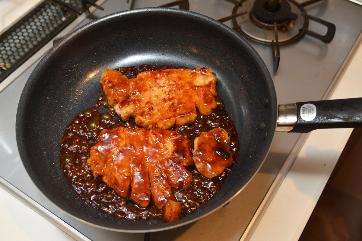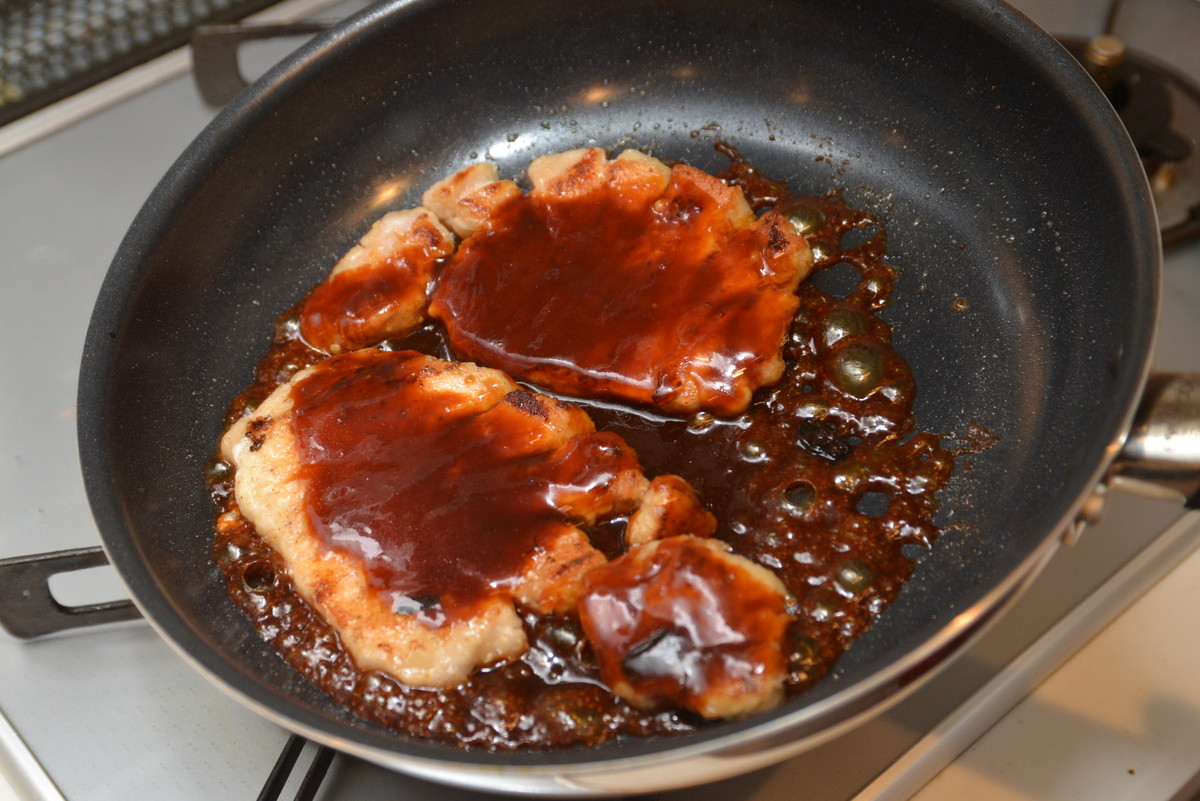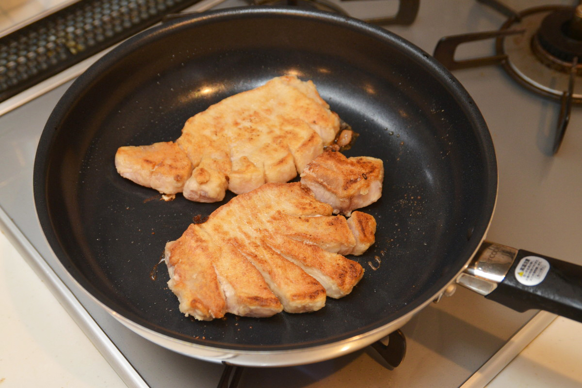 次に、焦げ付きやすい料理を作ってみます。フライパンを洗う時に苦労する料理といえば、肉のタレ焼き。今回は「トンテキ」にチャレンジします。厚切りの豚ロース肉の筋を軽く切ったあと、フライパンで焼いていきます。タレを入れてしっかりと肉にからめたら、お皿に盛り付けます。