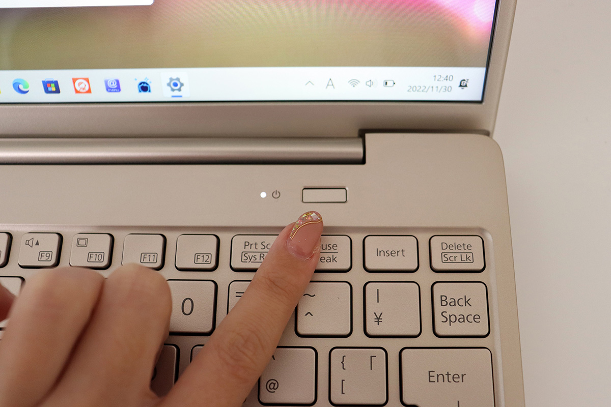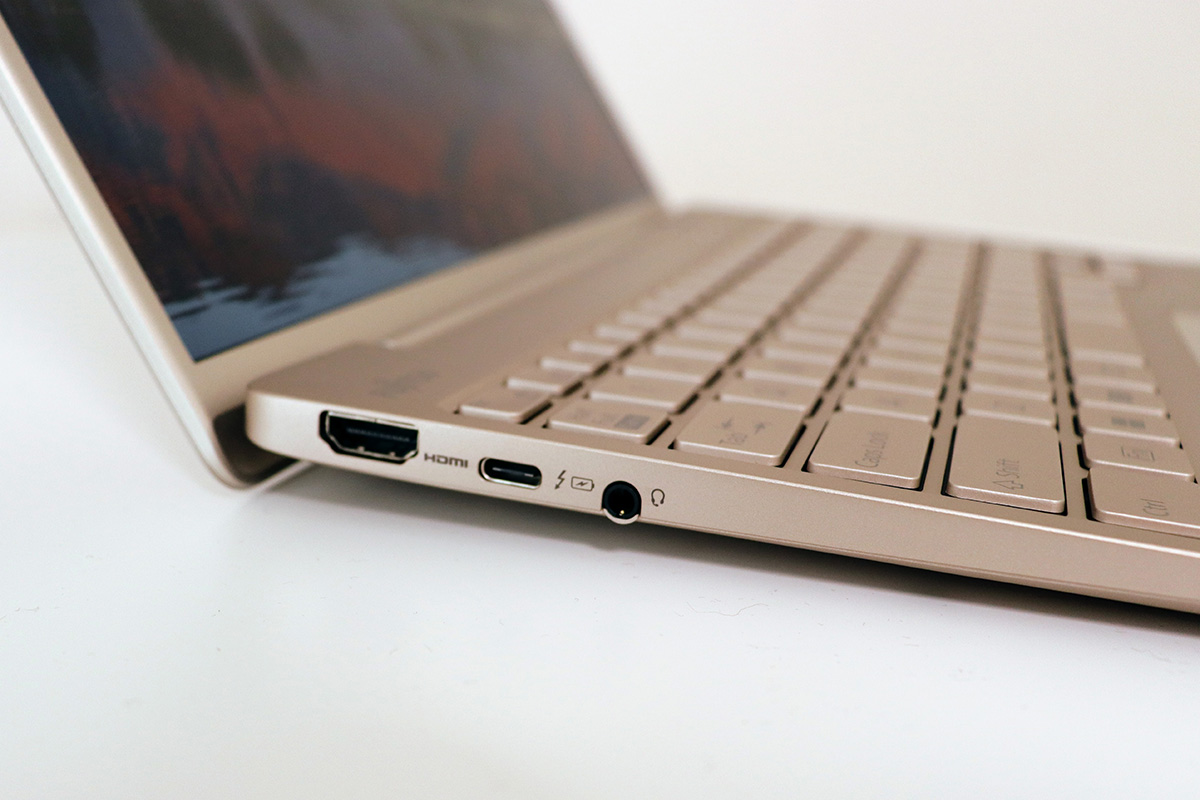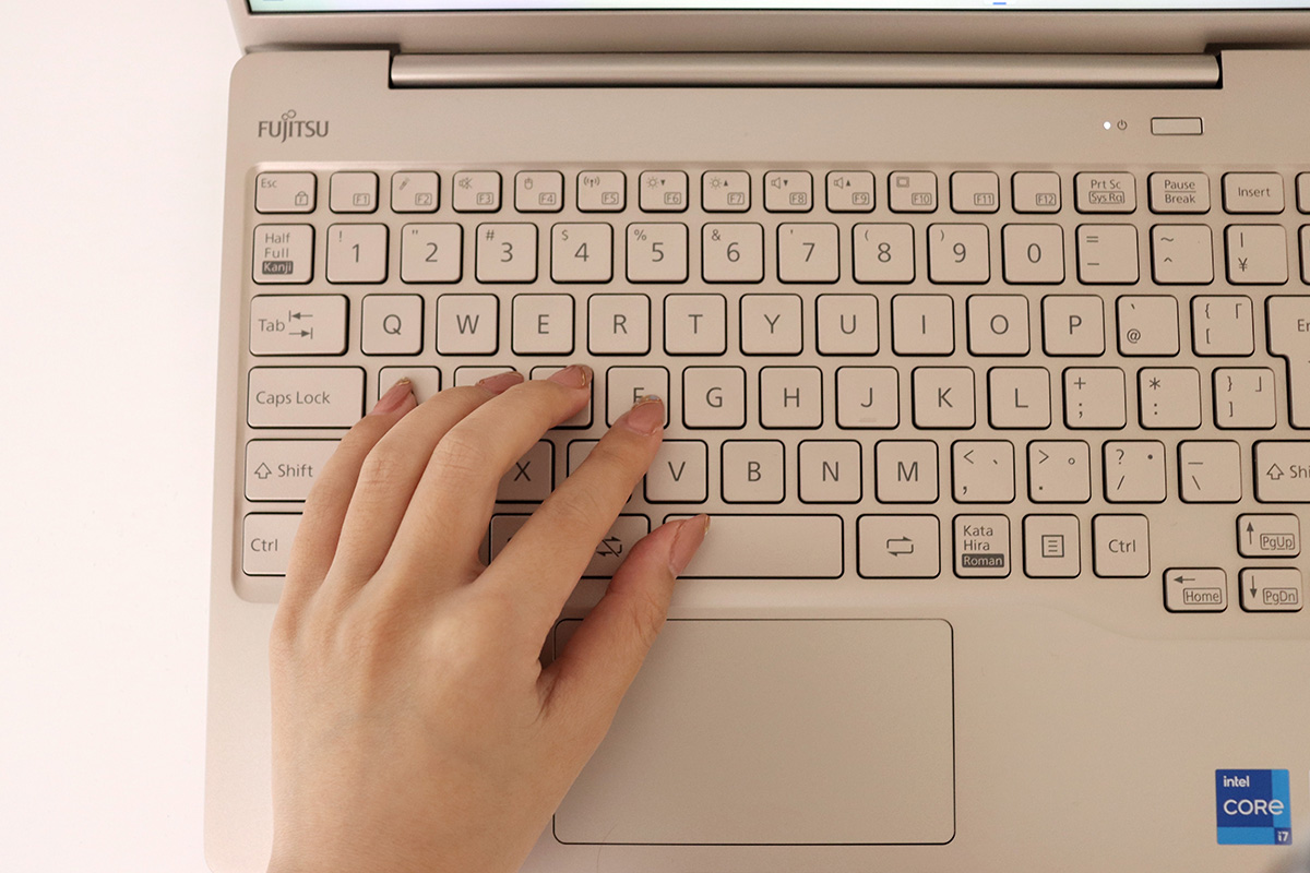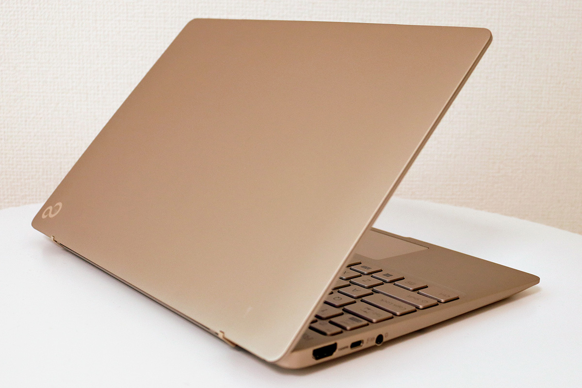 本体の重量はカラーで違っており、ピクトブラックのモデルは約876g、シルバーホワイトのモデルは約886g。バッテリーの持ち時間とその軽量さから、FMVのモバイルノートPCらしく持ち運びに適したモデルといえます。