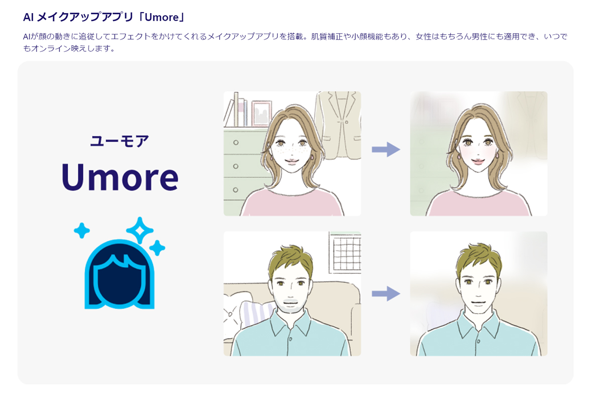 このほか、FMVならではの打鍵感にこだわったキーボード、オンライン会議などで自分の映りを好みに調整できるAIメイクアップアプリ「Umore」など、使い勝手のよい機能も備わっています。