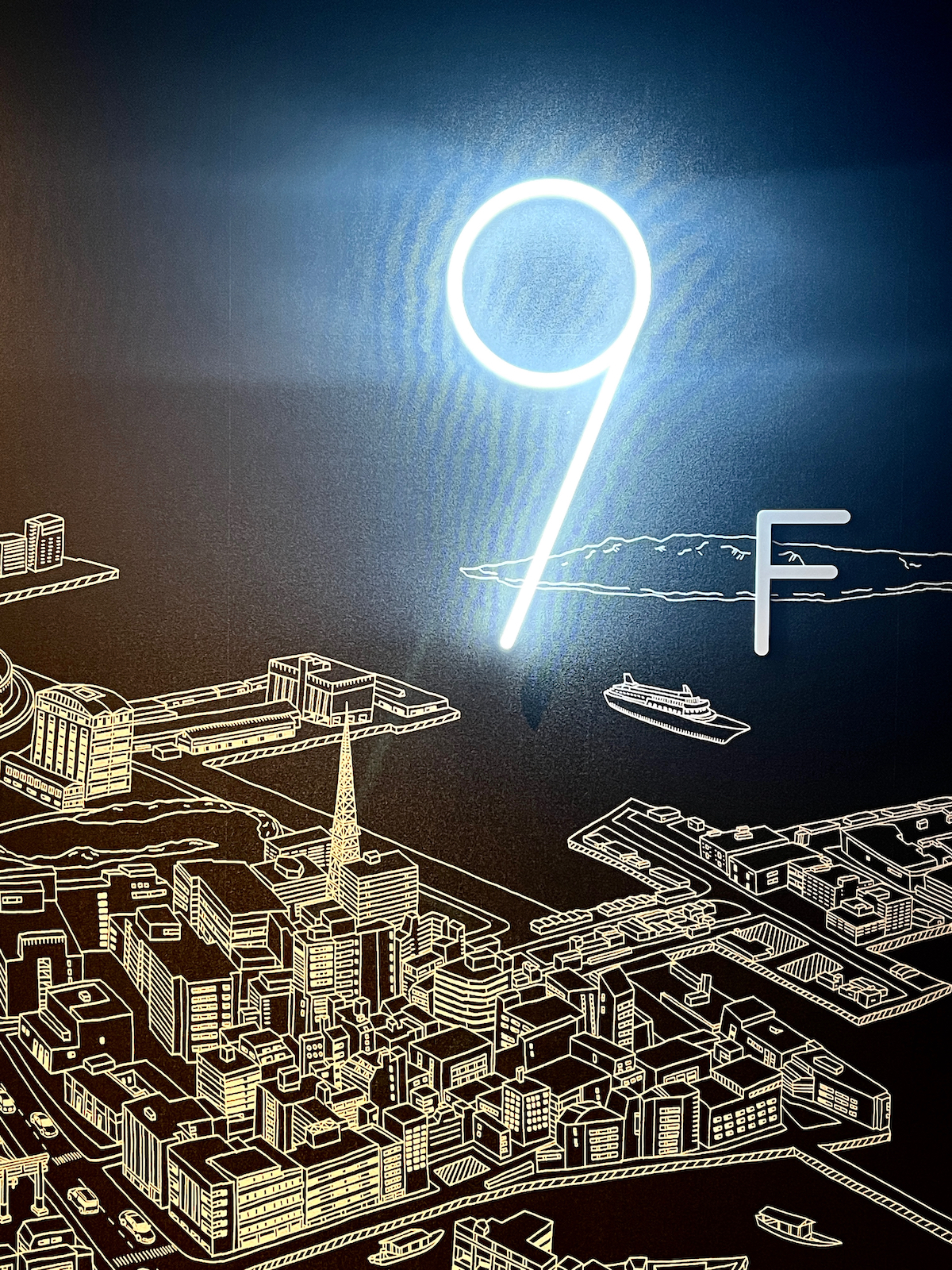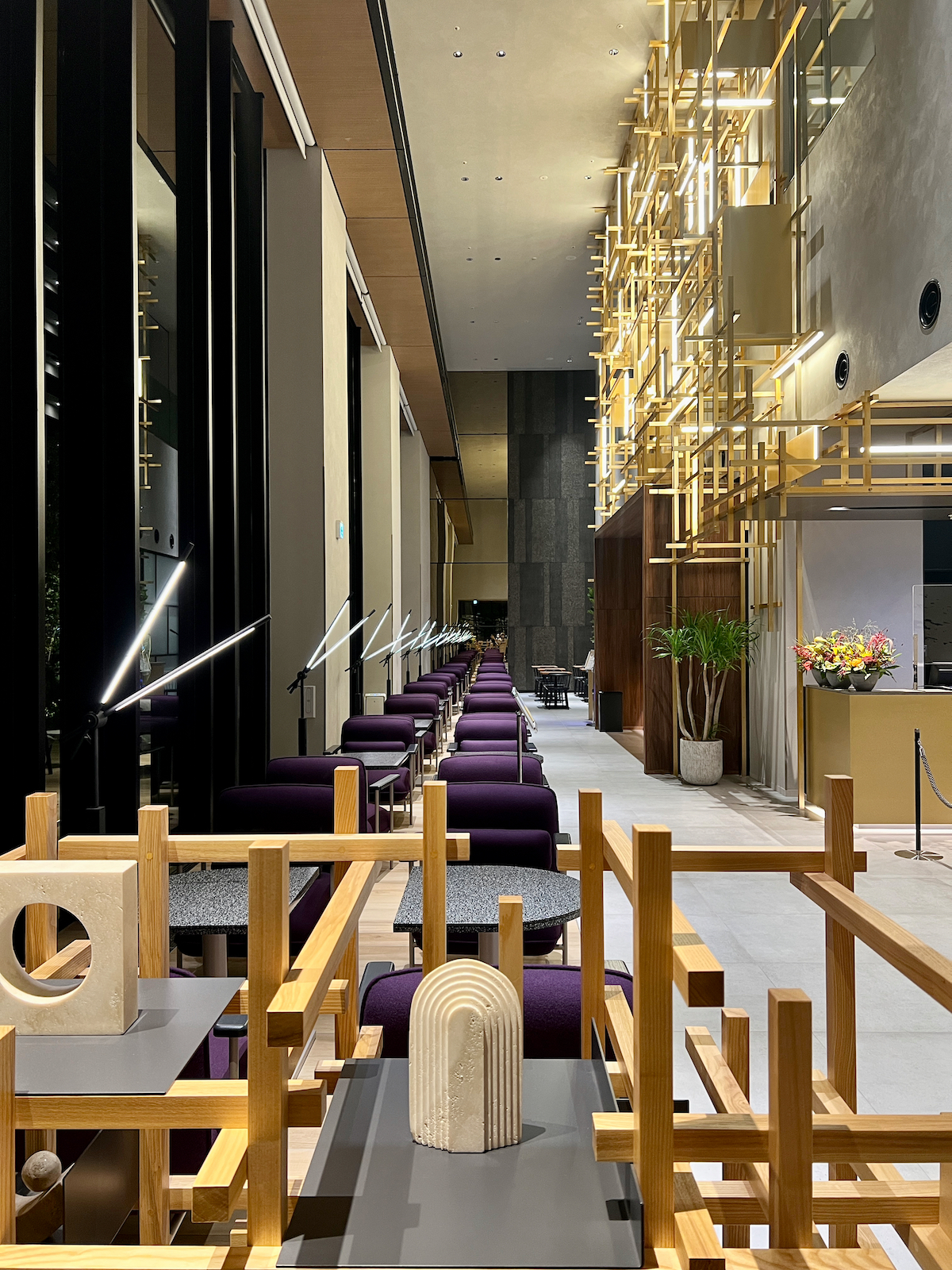 ↑アートとネオンサインが点在するソリッドな「クロスライフ博多天神」のロビーラウンジ