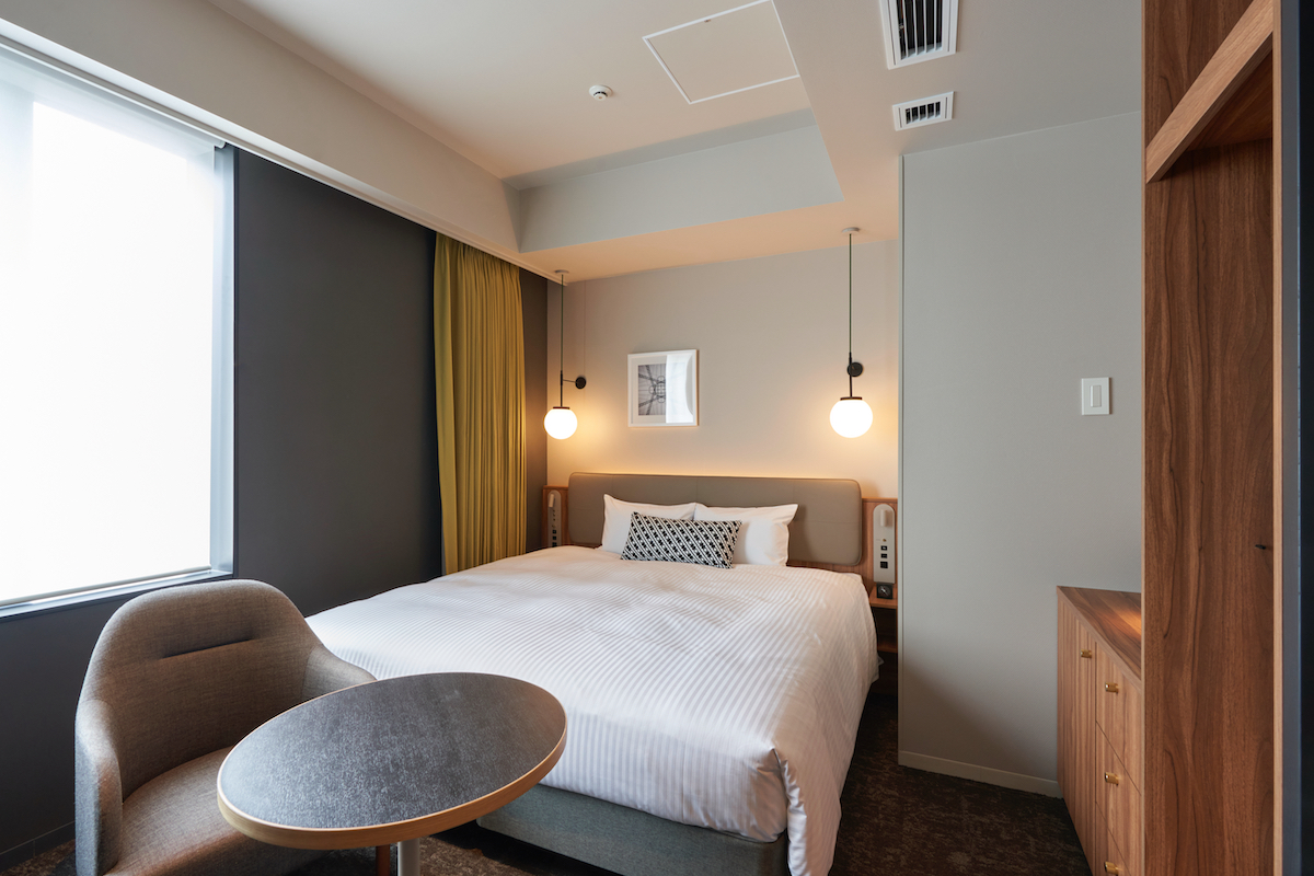 ↑客室。クロスライフ博多天神は「コンフォートツイン」(定員2名)、クロスライフ博多柳橋はソファベッド付きの「コンフォートツイン」(定員3名)がボリュームゾーン。写真はクロスライフ博多天神の「ユニバーサルキング」