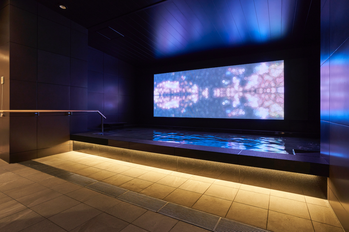 ↑大浴場には「NATURAL HEALING」をテーマにしたデジタルアートを設置。時間と共に刻々と変化する。浴場内にはサウナも完備する