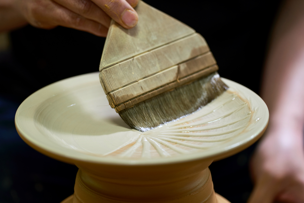 ↑写真のように刷毛を使って釉薬に模様をつけたり、刀で彫り込みをいれたりして独特の模様と風合いを生み出す