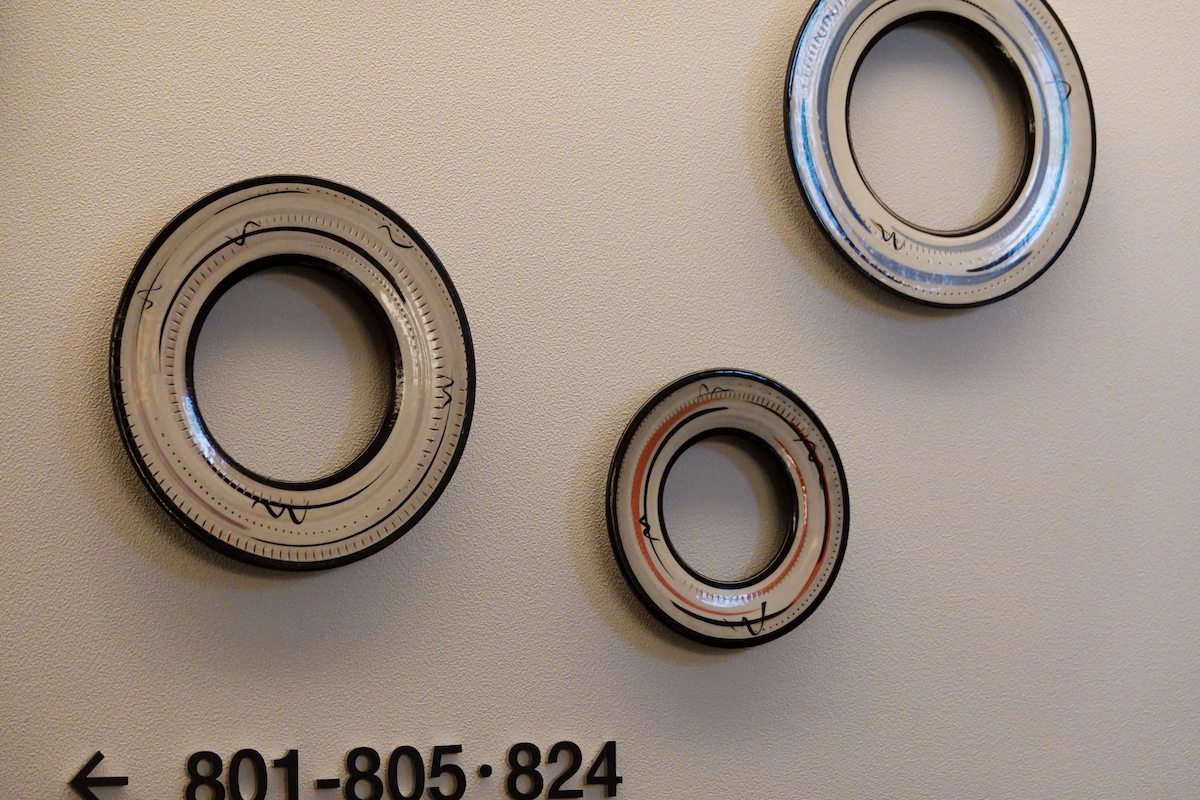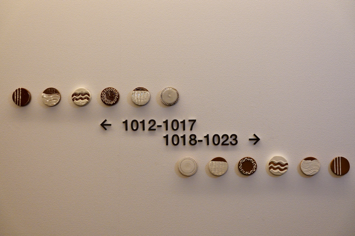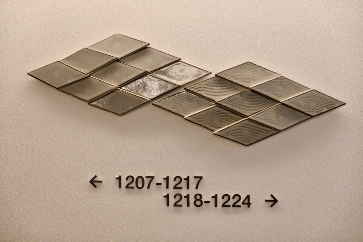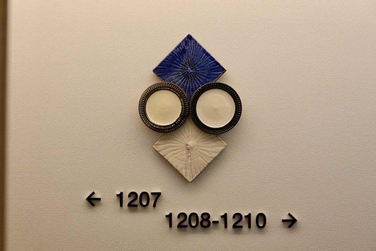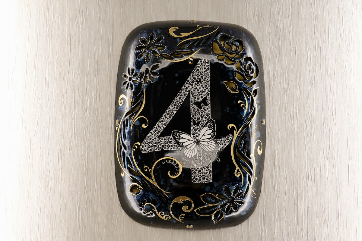 クロスライフではこの小石原焼を、博多柳橋の各階のサインに使用している。同じ小石原焼でも作家によって作風はまったく異なり、各階で違う作家の作品が階数を表示したり部屋番号を彩ったりしている。ただしセキュリティ上、宿泊階以外には行けないのが残念。ここに一部を紹介しよう。