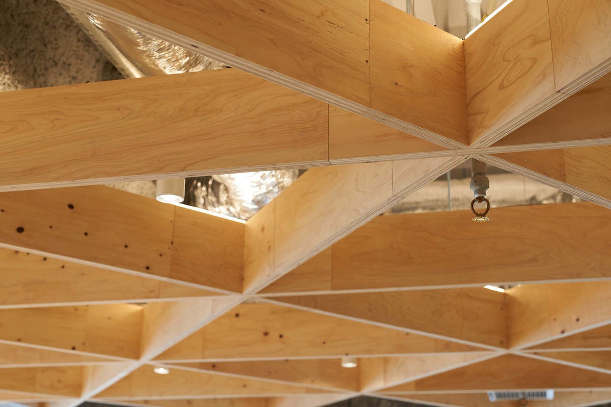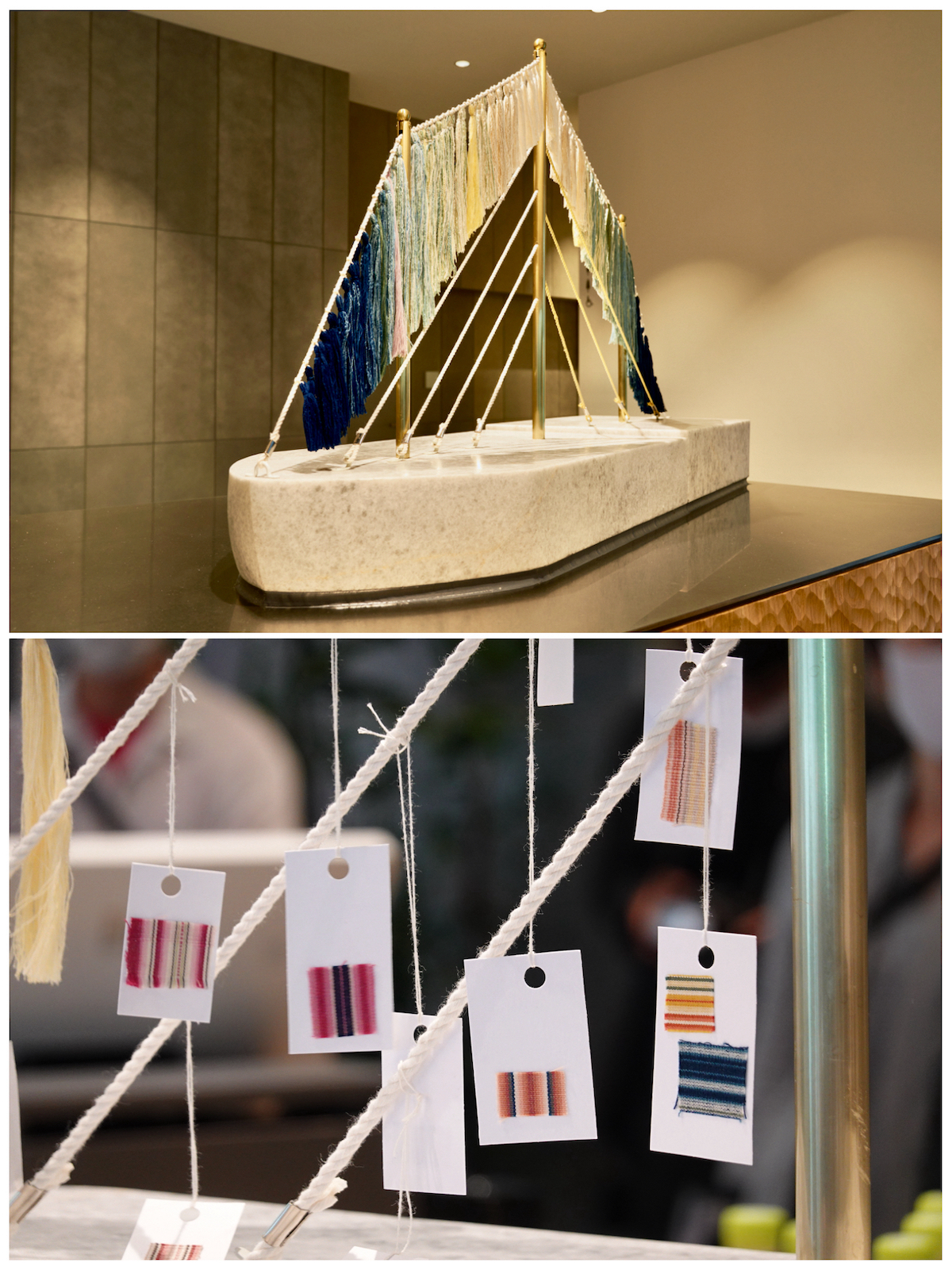 ↑クロスライフ博多柳橋のエントランスに鎮座するのは、福岡県在住の彫刻家によるもの。江戸時代に北九州で生まれた木綿織「小倉織」の端材を活用しており、ゲストはチェックイン時に渡される紐を自ら結んで完成に関われる