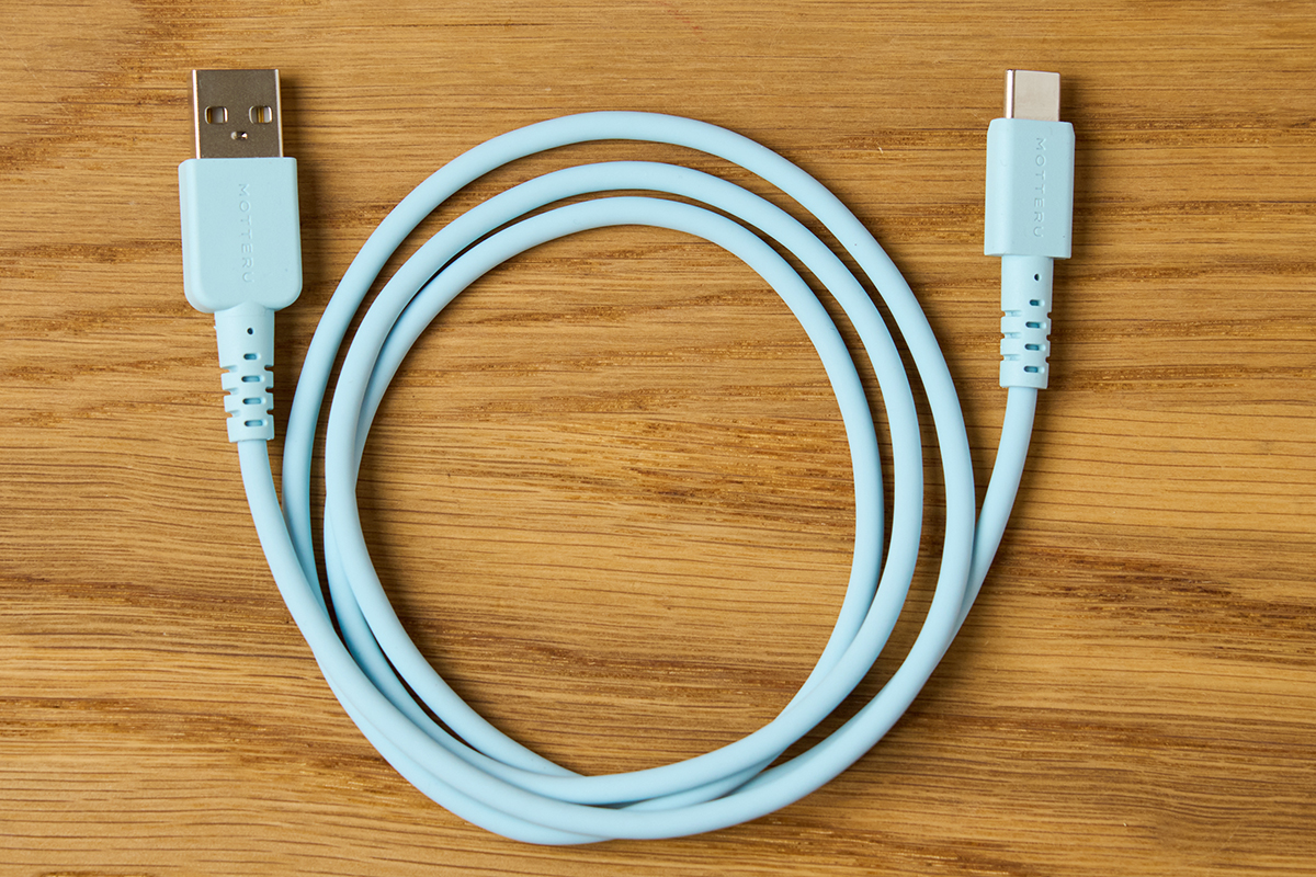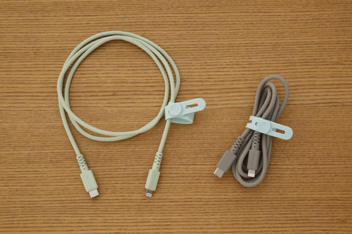 「シリコンケーブル USB A to USB Type-C」と「シリコンケーブル USB Type-C to Lightning」は、機能としては一般的なUSBケーブルですが、被膜にシリコンを採用したやわらかな手触りと、淡くさわやかな色味が特徴。今回はUSB A to USB Type-Cの「パウダーブルー」とUSB Type-C to Lightningの「ペールアイリス」をピックアップしています。