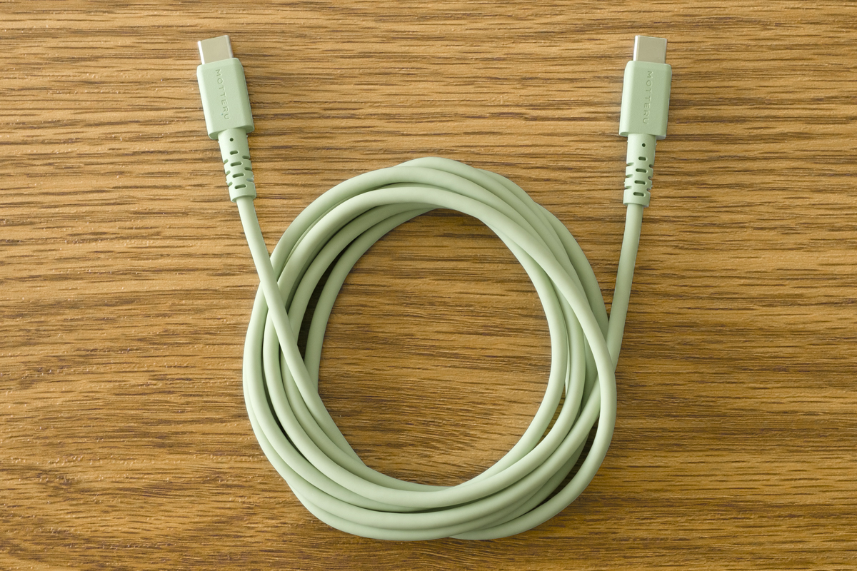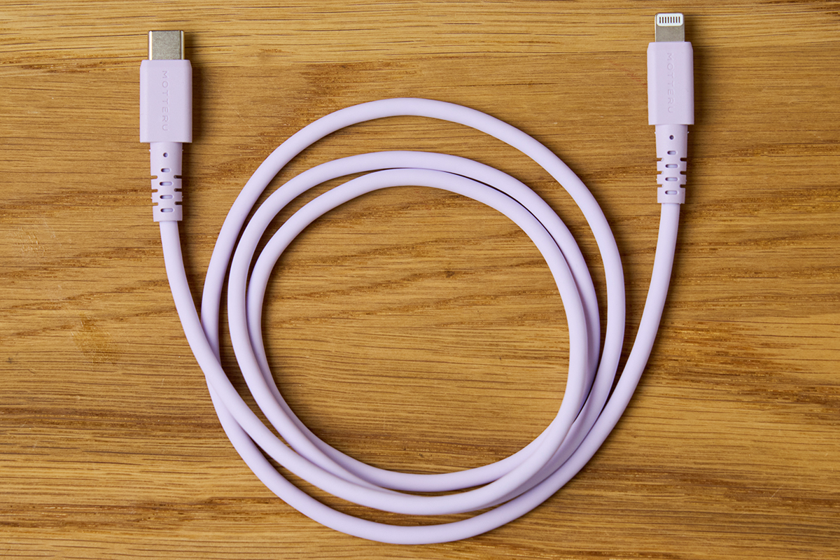 ↑USB Type-C to Lightningのシリコンケーブル「MOT-SCBCLG100」。赤ちゃんの肌のような触り心地と、5万回の折り曲げ試験をクリアするほどの断線に強い耐久性を実現しています。さらに、USB Power Deliveryに対応しており、対応のスマートフォンであれば約25分で約50%の急速充電が可能。中村さんはこの淡いカラーに惹かれたそうです