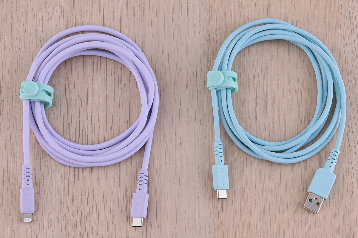 ↑左がシリコンケーブル USB Type-C to Lightning・MOT-SCBALG200(ペールアイリス/税込1880円)で、右がシリコンケーブル USB A to USB Type-C・MOT-SCBACG100(パウダーブルー/税込1280円)