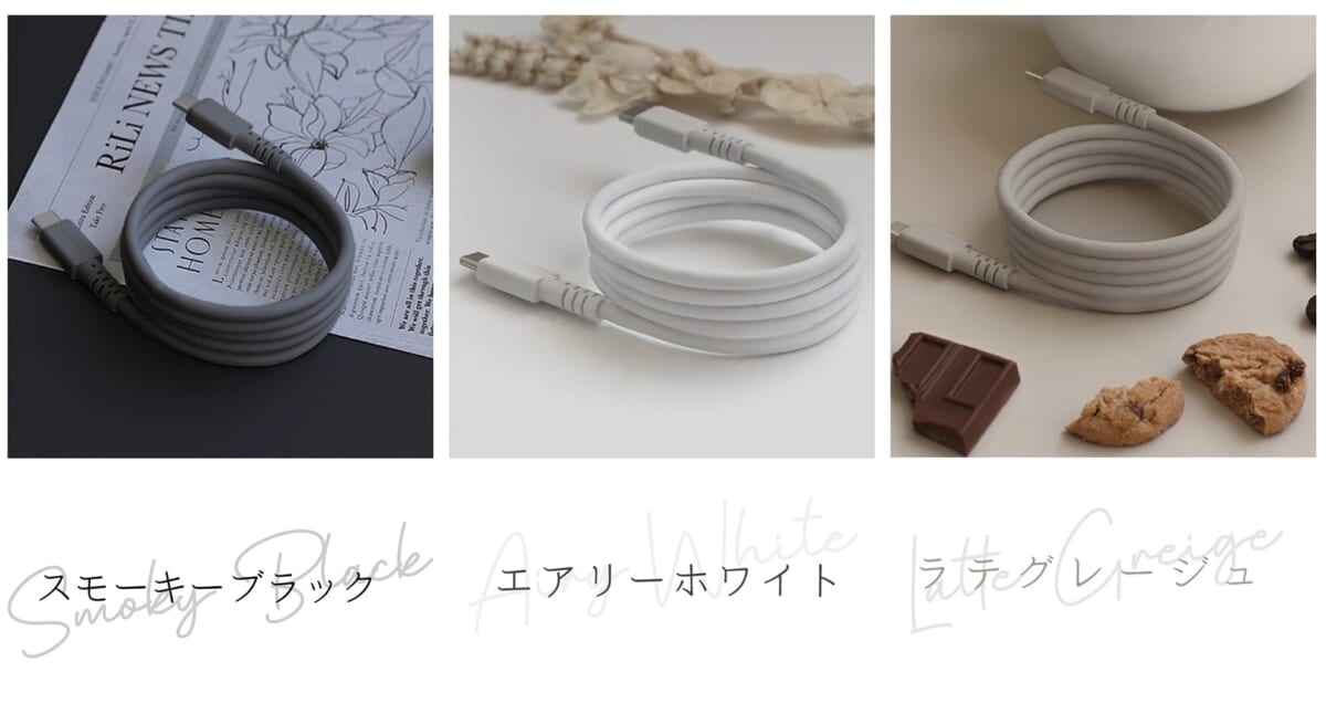 ラテグレージュの追加により、USB-A to LightningとUSB-A to USB-Cは全7色(他はスモーキーブラック、エアリーホワイト、シェルピンク、ペールアイリス、パウダーブルー、ピスタチオ)のラインナップ、USB-C to LightningとUSB-C to USB-Cは全5色(他はスモーキーブラック、ペールアイリス、パウダーブルー、ピスタチオ)のラインナップとなりました。