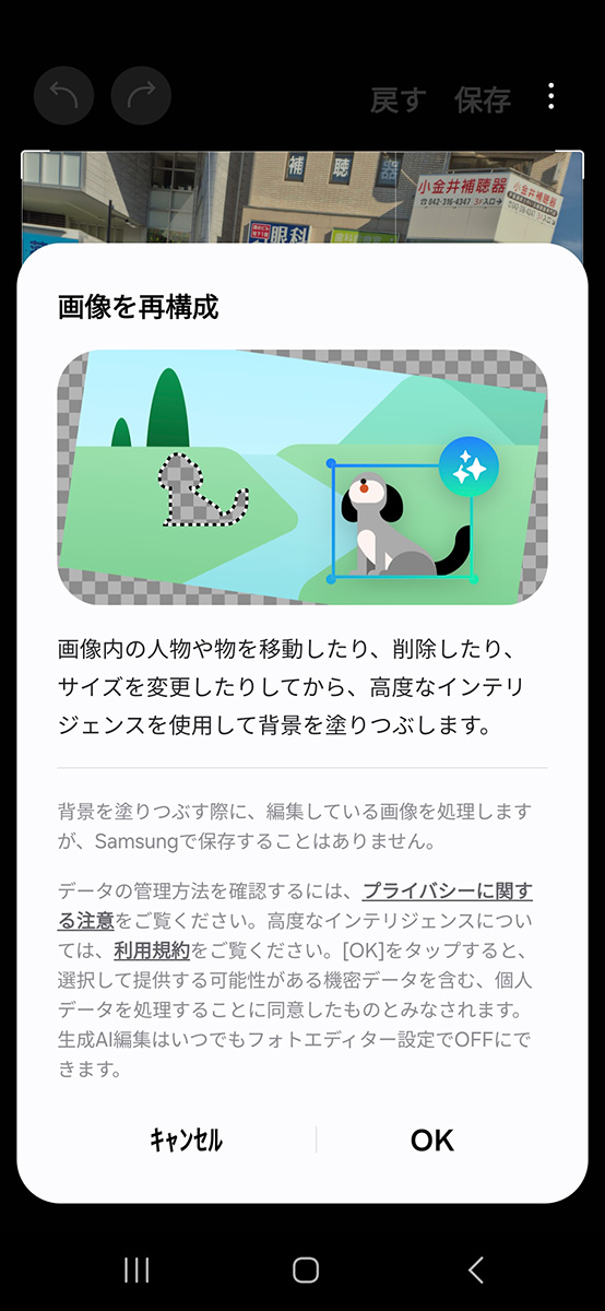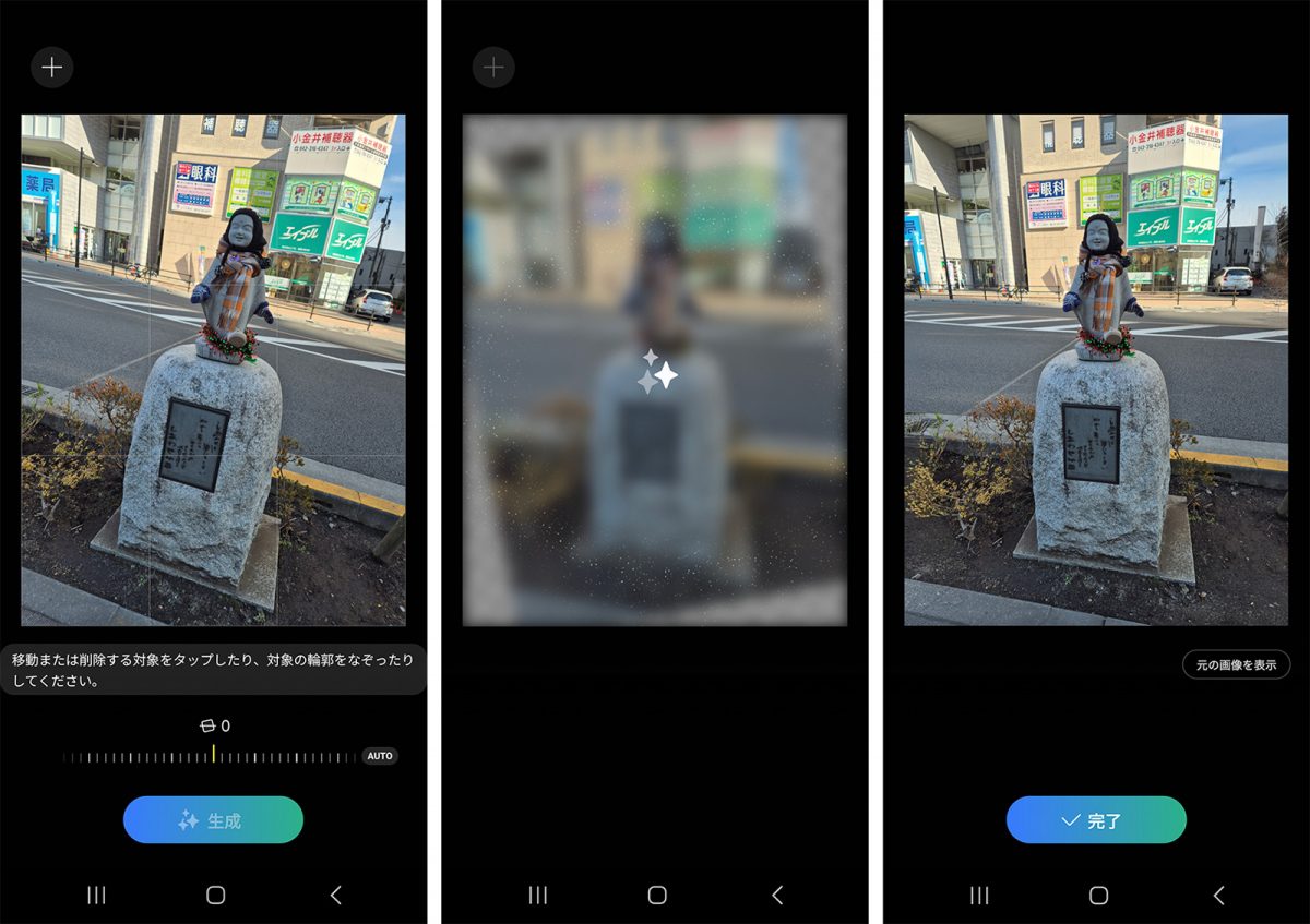 Google フォトのAI編集機能にはほかにも、写真の背景を引き延ばせる「オートフレーム」があります。被写体に寄りすぎて窮屈に見える写真にゆったりとスペースを作ったり、タテに構えて撮った写真をヨコ向きに近い印象に作り替えたりしてくれます。被写体にもよりますが、自然の風景などであれば比較的違和感のない画像を生成・拡大してくれます。