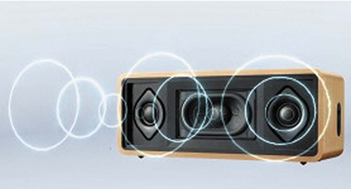 Era 300はコンパクトな本体に6基のスピーカーユニットを内蔵。ユニットは左右にウーファーとドーム型トゥイーターを計4基、同じドーム型トゥイーターを正面と天面に向けて1基ずつ搭載しました。さらに、トゥイーターの中高音域に広がりを持たせるため、ユニットの先端にホーン構造のウェーブガイドを設けています。