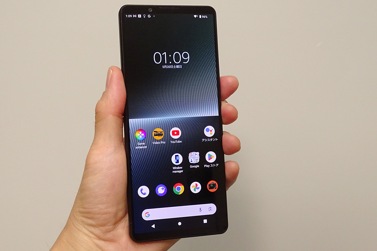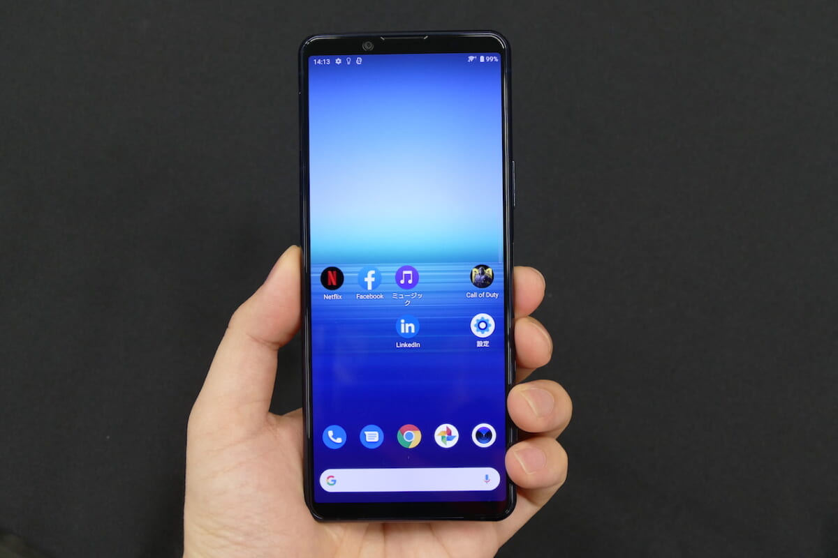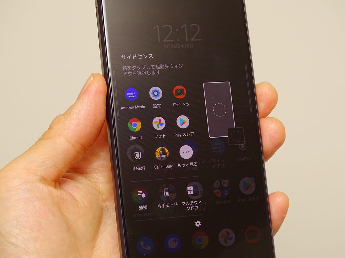 長辺の長さが約165mm(iPhone 12 Pro Maxは160.8mm)もあるので、質量は約188gと片手で持てるサイズ感ではあるものの、親指が画面の上から下まで一息では届きにくいと思います。ディスプレイのサイドをダブルタップして、アプリやクイック設定のランチャーを表示する「サイドセンス」を活用するか、または両手がフリーにできない場面では画面をコンパクトにして左右に寄せられる「片手モード」をマスターしておくと安心です。