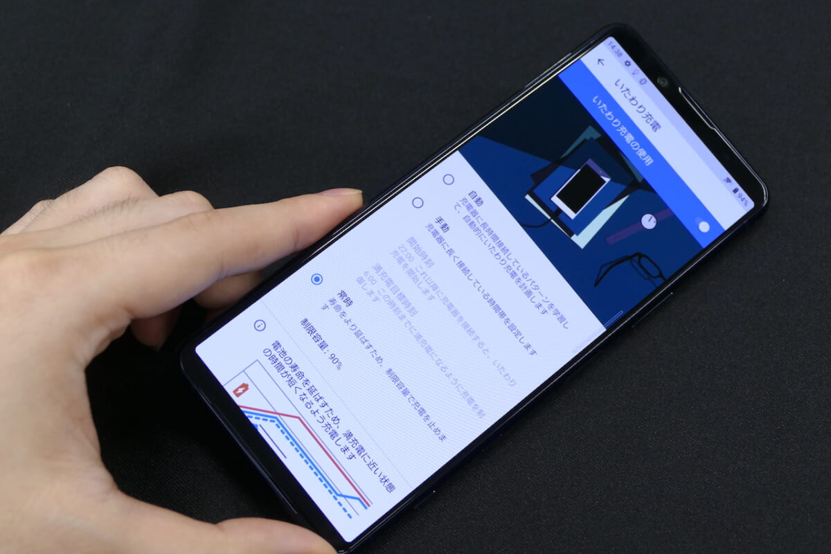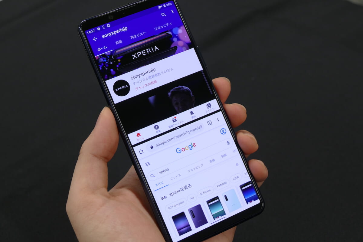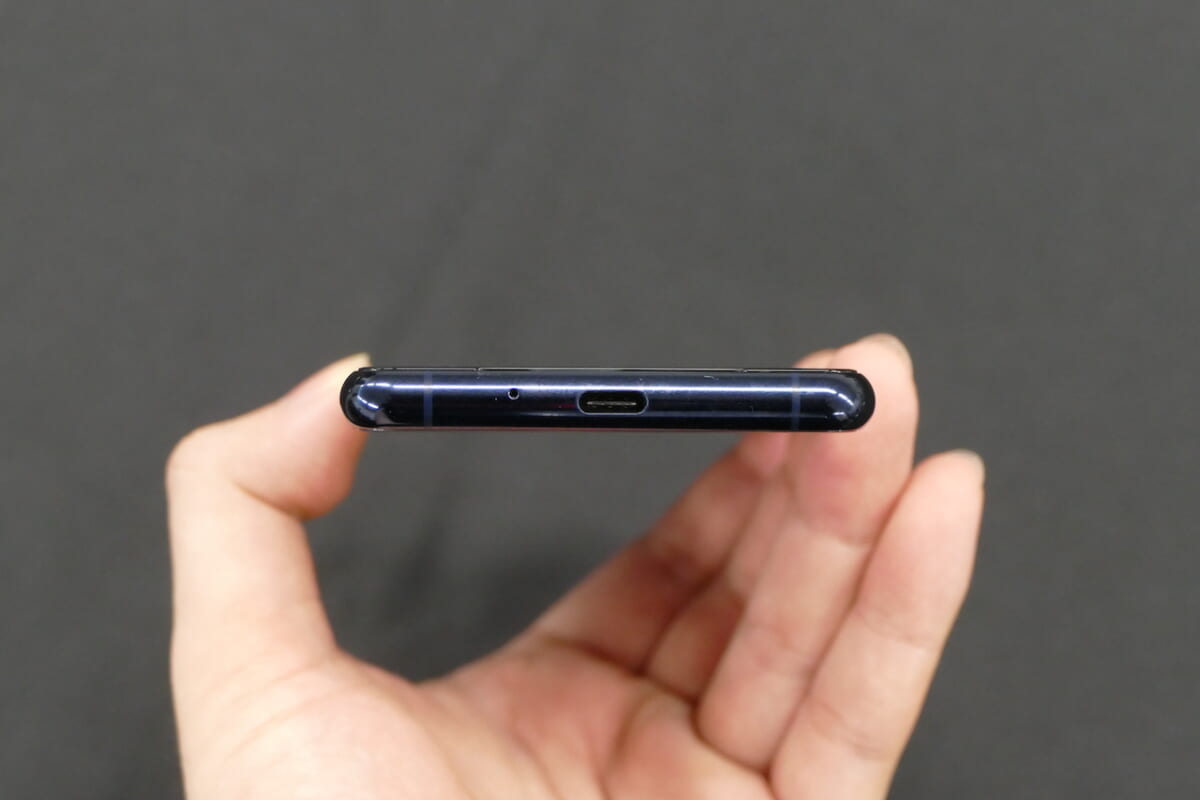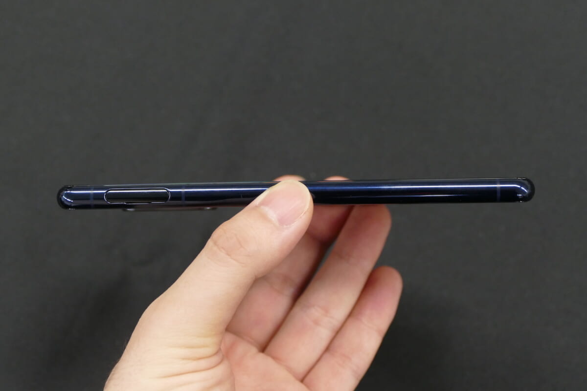 長辺の長さが約165mm(iPhone 12 Pro Maxは160.8mm)もあるので、質量は約188gと片手で持てるサイズ感ではあるものの、親指が画面の上から下まで一息では届きにくいと思います。ディスプレイのサイドをダブルタップして、アプリやクイック設定のランチャーを表示する「サイドセンス」を活用するか、または両手がフリーにできない場面では画面をコンパクトにして左右に寄せられる「片手モード」をマスターしておくと安心です。