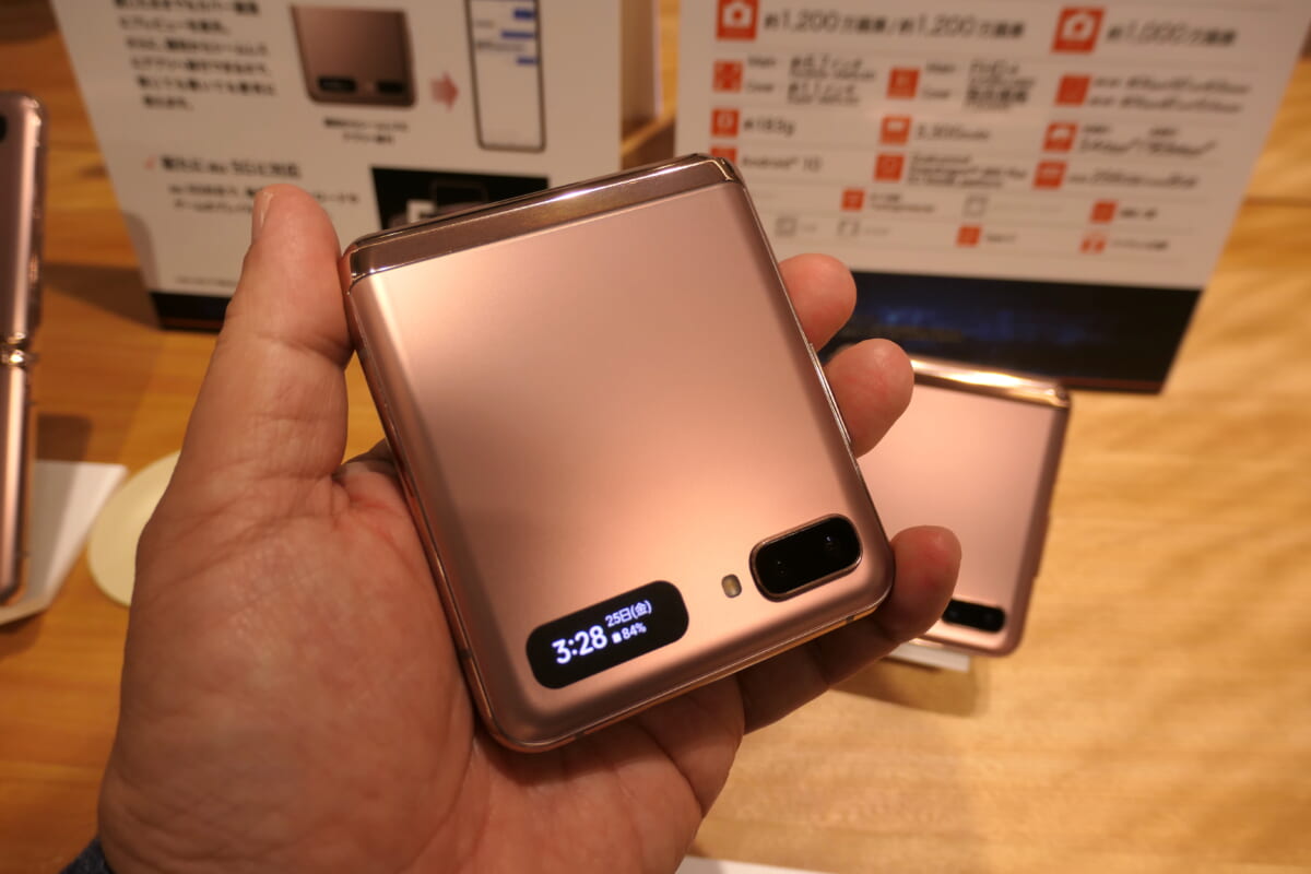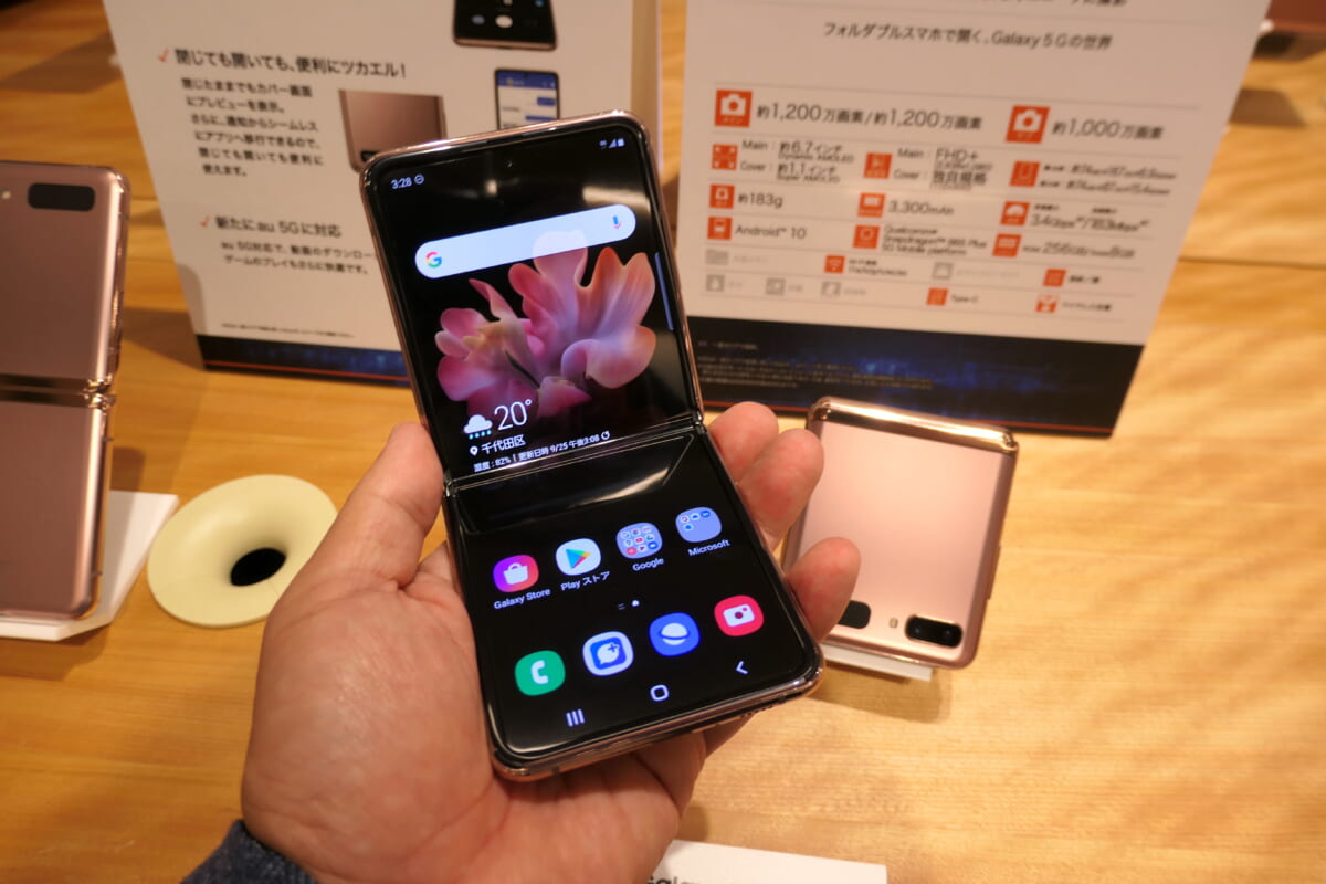 Galaxy Z Flip 5Gは、2月に発売された4GモデルのGalaxy Z Flipを5Gに対応させたもの。5Gになってもサイズ感はそのまま。コンパクトに折りたたんで持ち歩けて、使うときに開いて約6.7インチの大画面を利用できます。折りたたみ時には小さいサブディスプレイで時刻や通知を確認できます。世代によっては、ガラケーの使い勝手が返ってきたようで、懐かしく感じるかもしれません。