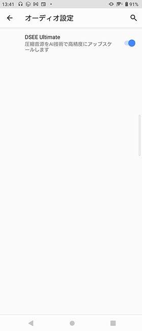 2つめは、Xperia 10 III Liteに搭載されている、どんな音源もCDを超えるハイレゾ相当の音質にアップスケーリングしながら再生する「DSEE Ultimate」という機能です。これは、「設定」アプリから「音設定」に入り、「オーディオ設定」に並ぶDSEE Ultimateをオンにすることで、音楽配信サービスのストリーミング、MP3形式などでダウンロードできる音楽ファイル、YouTubeのサウンドなど、圧縮された音声データを再生時にリアルタイム補完。圧縮された際に失われがちな中高音域の伸びやかさや、滑らかさをよみがえらせます。