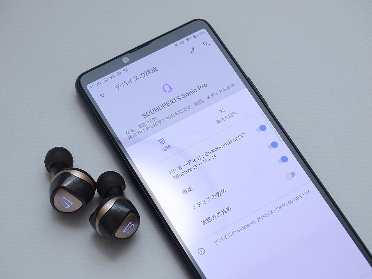 ひとつめは、Xperia 10 III Liteがクアルコムの「aptX Adaptive」というBluetoothオーディオのコーデック(符号化技術)に対応していることです。同じaptX Adaptiveに対応するワイヤレスヘッドホン・イヤホンにペアリングすると、最大48kHz/24bitまでのハイレゾ音源を楽しめます。