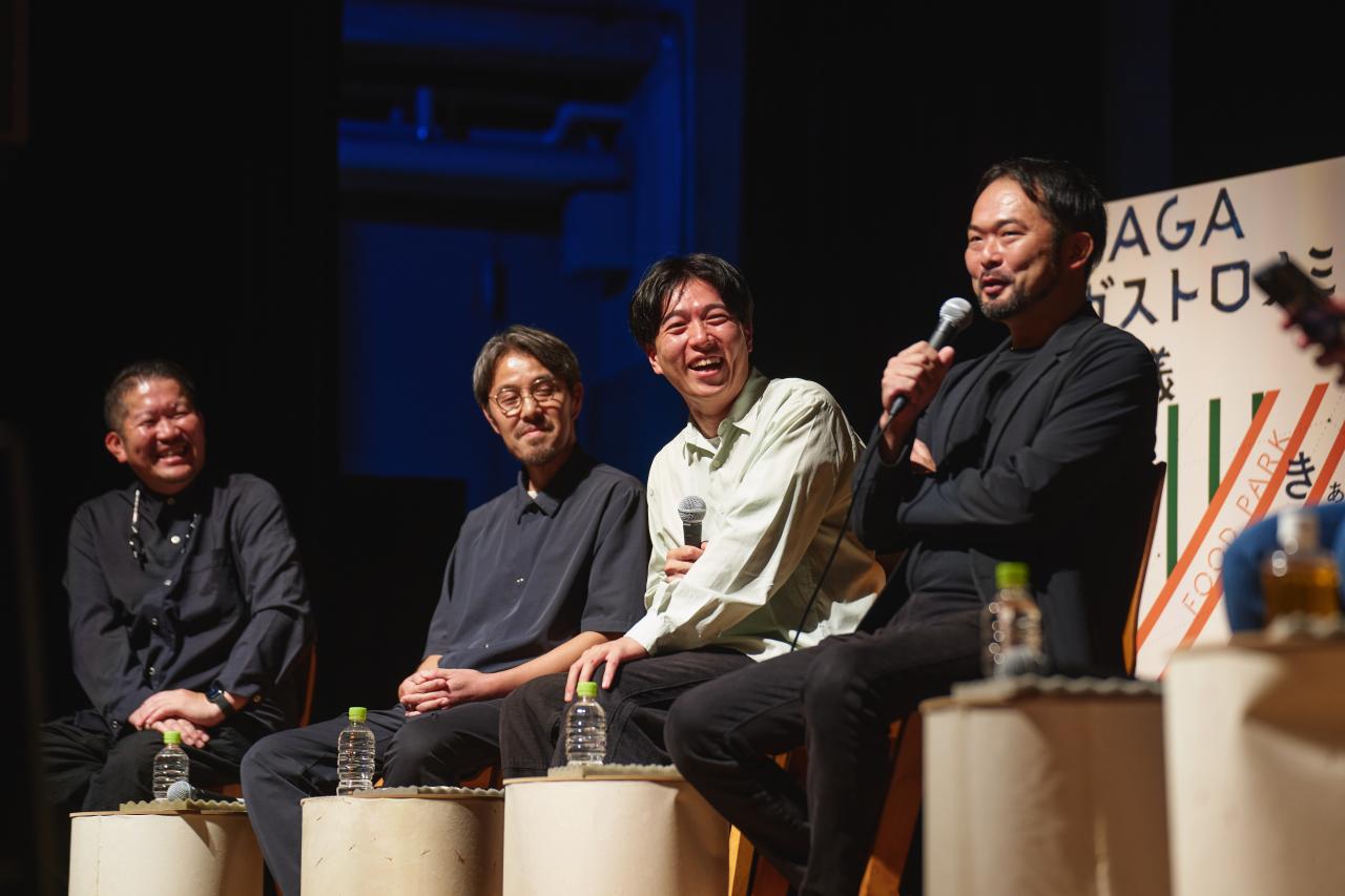最後を飾るトークセッションでは、佐賀ならではのテーマ「【器と料理】器と料理の創造性に溢れた共創のかたち」が掲げられました。スピーカーは、器の作り手として、唐津焼の窯元「隆太窯」の中里健太氏と、伊万里焼の窯元「畑萬陶苑」の畑石修嗣氏。料理人として、福岡のフレンチレストラン「Goh」「Goh Gan」のシェフ・福山剛氏と、長崎のイタリアンレストラン「villa del nido」のシェフ・吉田貴文氏。情報発信者の立場から九州にフォーカスしたでメディア「クオリティーズ」編集長の日野昌暢氏、日本全国の美食を取り上げる「食楽web」プロデューサーの大西健俊氏が参加。「サガマリアージュ」を立ち上げた佐賀県政策部の安冨喬博氏がファシリテーターを務めました。