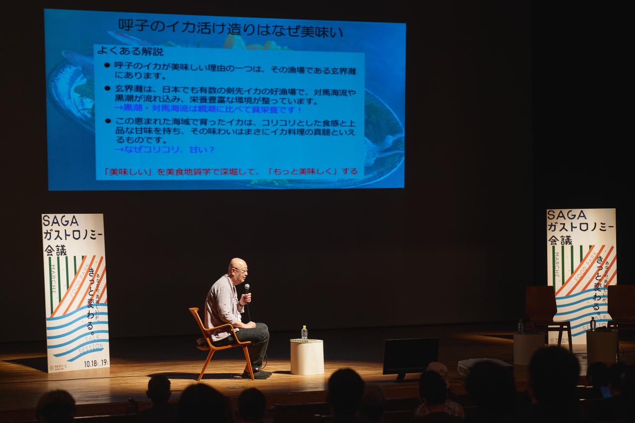 目玉は「TALK SESSION」。その口火を切ったのは、「マグマ学」を専門とする地球科学者・巽好幸氏による「【地質学】美食地質学が紐解く、佐賀の食」です。同氏は、マグマやプレートなど地球のダイナミックな動きと地域の食文化との関係を解き明かす美食地質学の創始者。地形や地質が農業や産物、調味料、調理法へもたらした影響について科学的根拠を示し、なぜその食材がおいしいのか? なぜその食材が地域で好まれているのか? といった素朴な疑問に答えていきます。