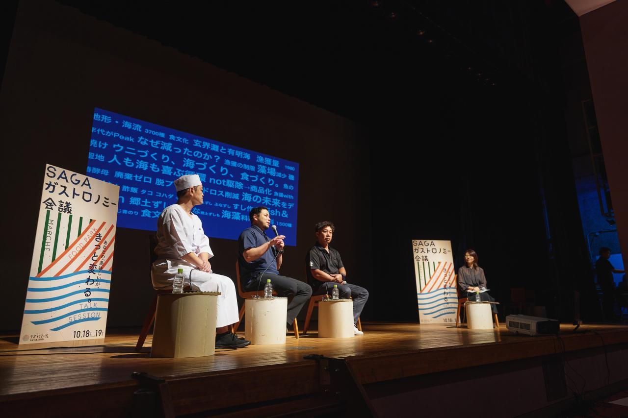 「【海の資源】九州の海から考える。海と食のサステナブルな関係」には、4人の個性的なスピーカーが登壇しました。まず一人目が、東京・文京区ですし店「酢飯屋」を経営しながら、福岡を拠点にすし作家、海藻料理研究家として活動する岡田大介氏。そして、全国屈指の漁場と言われる長崎県五島列島で創業70年の鮮魚店「金沢鮮魚」を営む金澤亮氏。地元佐賀からは、唐津の漁師「袈裟丸水産」代表の袈裟丸彰蔵氏が参加しました。ファシリテーターを務めたのは、豊かな海と食文化を未来につなぐために東京・京都のトップシェフ約40名で構成される団体「Chefs for the Blue」代表で、フードジャーナリストの佐々木ひろこ氏です。